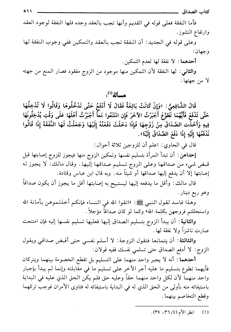 قَالَ الشَافِعِيُّ: "وَإن كَانَت بَالِغَةً فَقَالَ لا أدفَعُ حَتَّى تَدخُلُوهَا وقَالُوا لا تُدخِلُهَا حَتَّى تَدفَعَ فَأيُّهُمَا تَطَوَّعَ أَجبَرتُ الآخَرَ فَإن امتَنَعُوا مَعًا مِما أٌجبَرتُ أَهلَهَا عَلَى وَقتِ يُدخِلونَهَا فِيهِ وَأخَذَت الصَّدَاقِ مِن زَوجِهَا فَإذَا دَفَعتُهُ إليهَا وَجَعلَت لَهَا النَفَقَةَ إذا قَالوا نَدفعَهَا إلَيهِ إذا دَفَعَ الصَّدَاقَ إليَنَا".