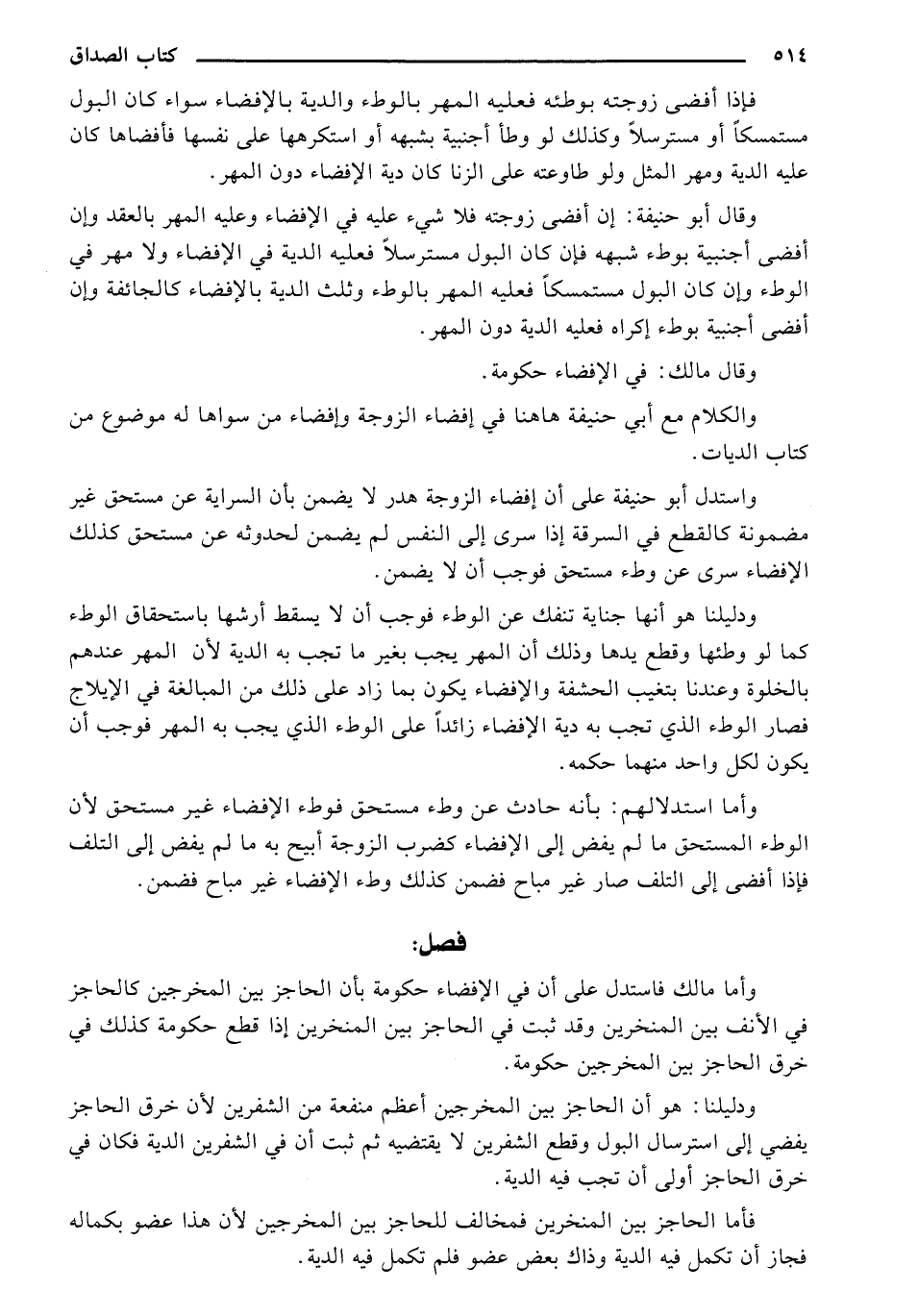 والكلام مع أبي حنيفة على أن إفضاء الزوجة هدر لا يضمن بأن السراية عن مستحق غير مضمونة كالقطع في السرقة إذا سرى إلى النفس لم يضمن لحدوثه عن مستحق كذلك الإفضاء سرى عن وطء مستحق فوجب أن لا يضمن.