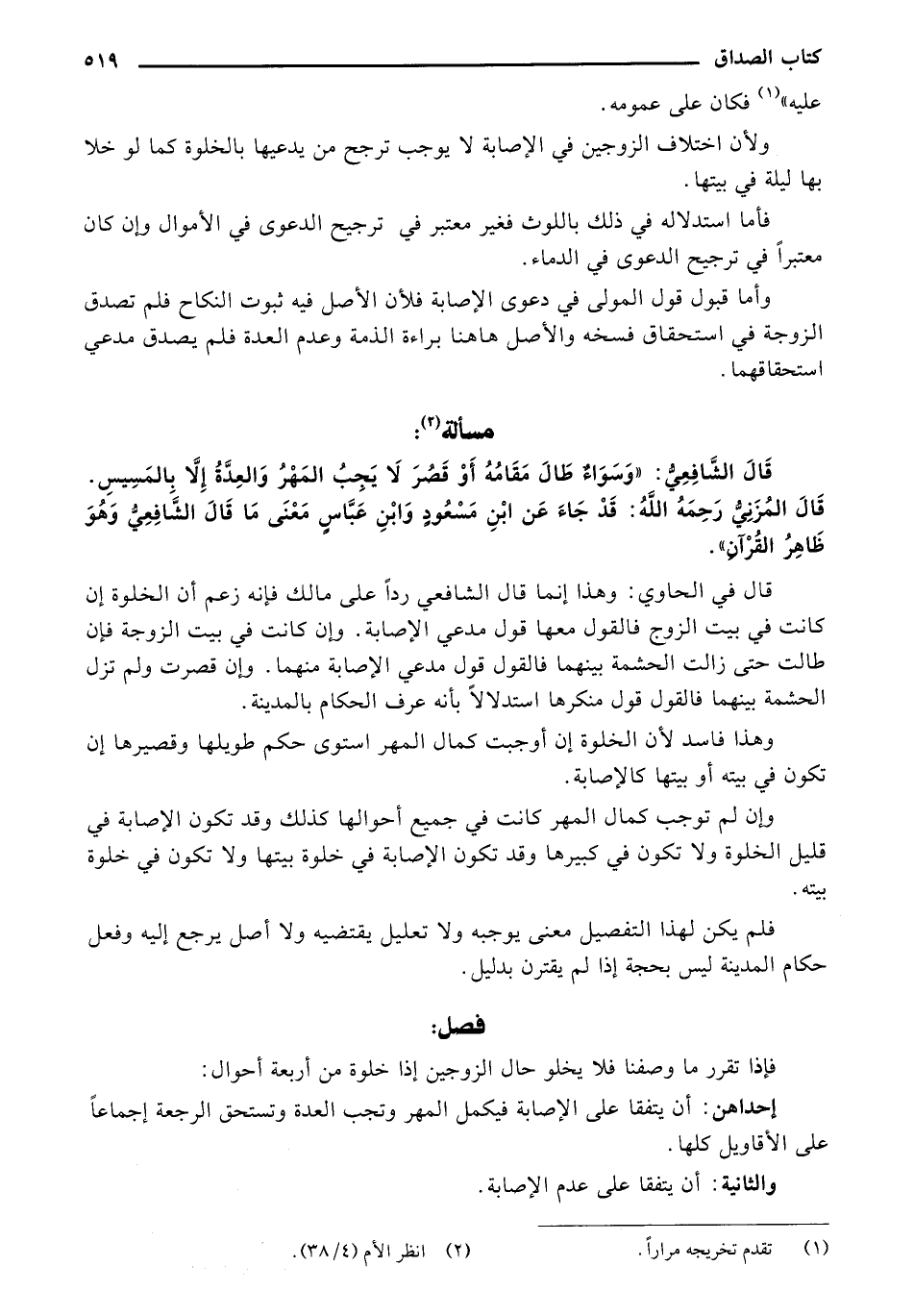 قَالَ الشَّافِعِيُّ: "وَسَوَاءَ طَالَ مَقَامُهُ أو قَصُرَ لَا يَجِبُ المَهرُ والعِدَّةُ إلَّا بِالمَسيسِ. قَالَ المُزنِيُّ رَحِمَهُ الله: قَد جَاءَ عَن ابنِ مَسعُودٍ وابنَ عَبَاسٍ مَعنَى مَا قَالَ الشَّافِعِيُّ وَهوَ ظَاهِرُ القُرآن".
