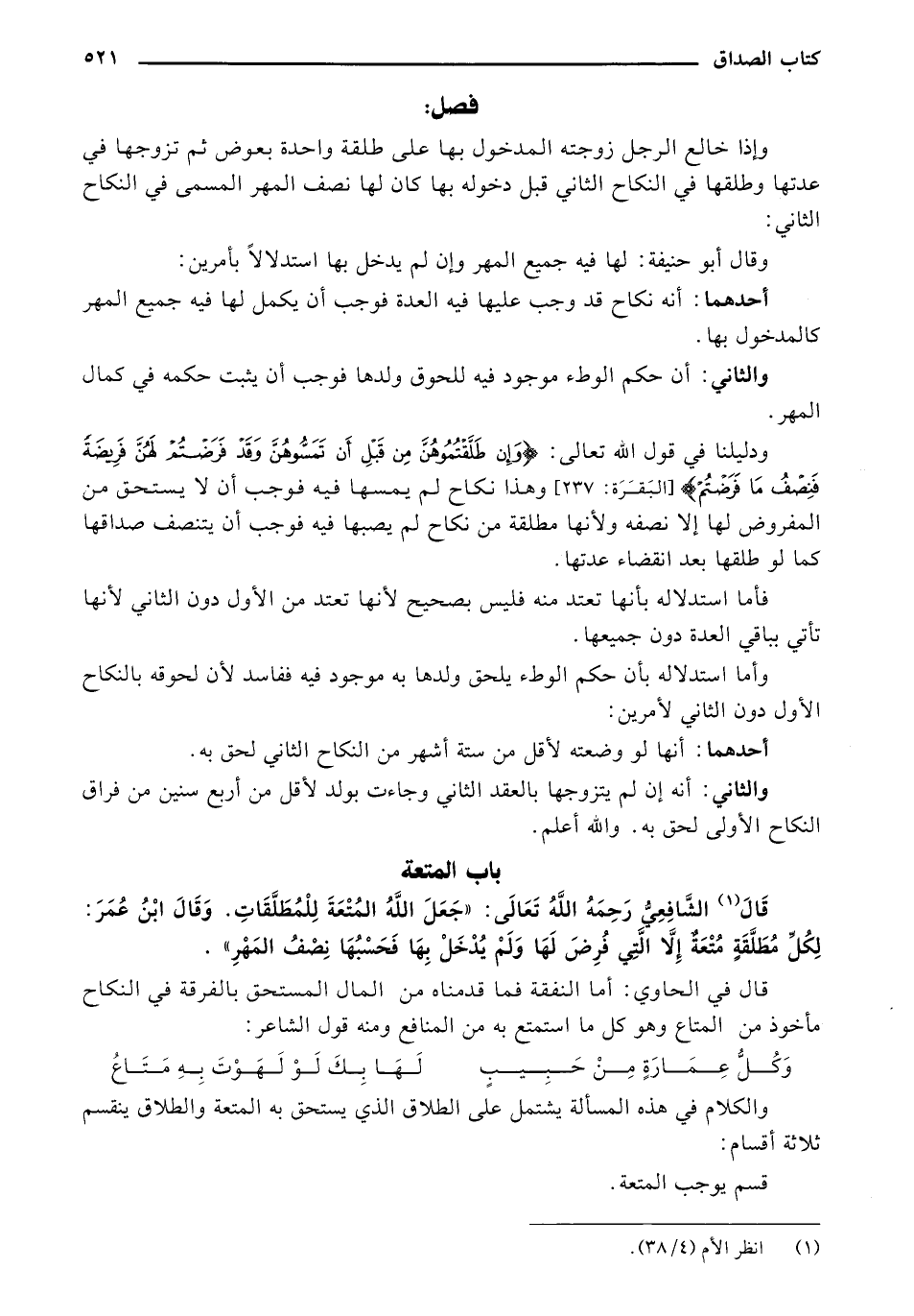 قَالَ الشَّافِعِيُّ رَحِمَهُ اللهُ تَعَالَى: "جَعَلَ اللهُ المُتْعَةَ لِلْمُطَلَّقَاتِ. وَقَالَ ابْنُ عُمَرَ: لِكُلِّ مُطَلَّقَةٍ مُتْعَةٌ إِلَّا الَّتِي فُرِضَ لَهَا وَلَمْ يُدْخَلْ بِهَا فَحَسْبُهَا نِصْفُ المَهْرِ".