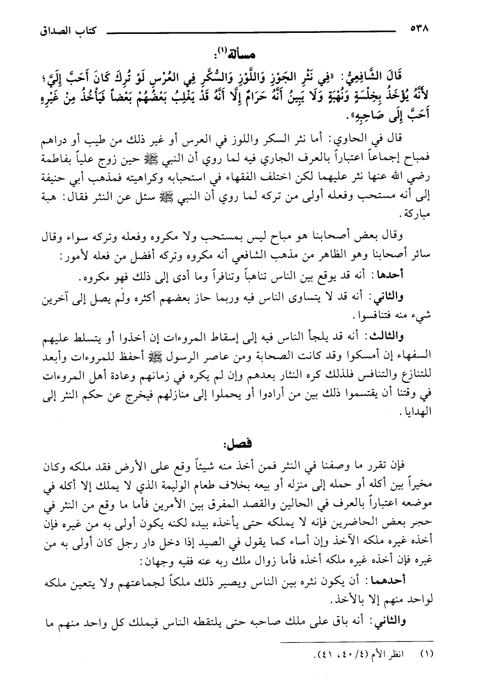 قَالَ الشَّافِعِيُّ: " فِي نَثْرِ الْجَوْزِ وَاللَّوْزِ وَالسُّكَّرِ فِي الْعُرْسِ: لَوْ تُرِكَ كَانَ أَحَبَّ إِلَيَّ لِأَنَّهُ يُؤْخَذُ بِخِلْسَةٍ وَنُهْبَةٍ، وَلَا يَبِينُ أَنَّهُ حَرَامٌ، إِلَّا أَنَّهُ قَدْ يَغْلِبُ بَعْضُهُمْ بَعْضًا فَيَاخُذُ مِنْ غَيْرِهِ أَحَبَّ إِلَى صَاحِبِهِ".
