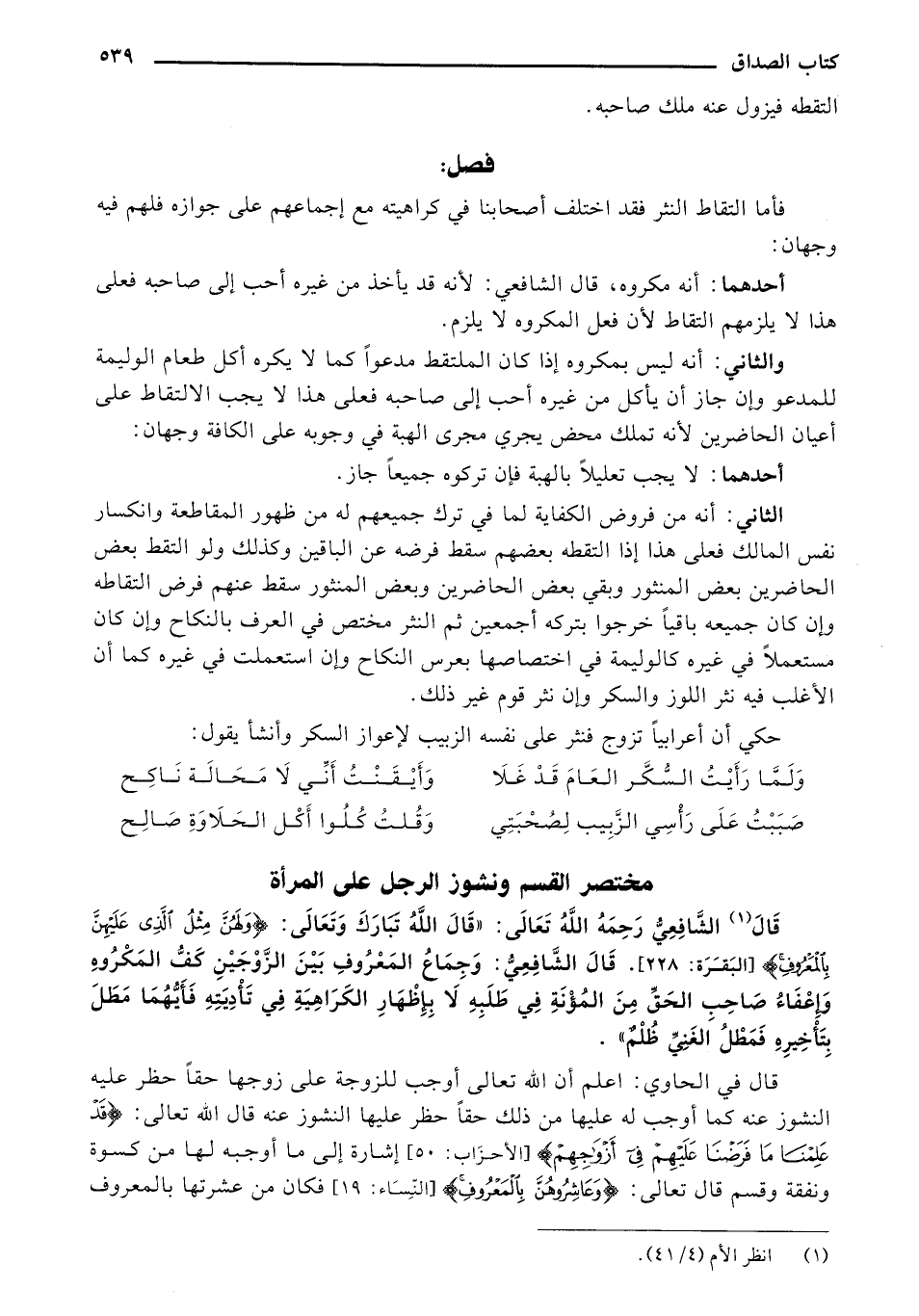 قَالَ الشَّافِعِيُّ رَحِمَهُ الله تَعَالَى: "قَالَ الله تَبَارَكَ وَتَعَالَى: {ولَهُنَّ مِثْلُ الَّذِي عَلَيْهِنَّ بِالْمَعْرُوفِ} [البقرة: 228]. قَالَ الشَّافِعِيُّ:" وَجِمَاعُ الْمَعْرُوفِ بَيْنَ الزَّوْجَيْنِ: كَفُّ الْمَكْرُوهِ، وَإِعْفَاءُ صَاحِبِ الْحَقِّ مِنَ الْمُؤْنَةِ فِي طَلَبِهِ، لَا بِإِظْهَارِ الْكَرَاهِيَةِ فِي تَادِيَتِهِ، فَأَيُّهُمَا مَطَلَ بِتَاخِيرِهِ، فَمَطْلُ الْغَنِيِّ ظُلْمٌ "