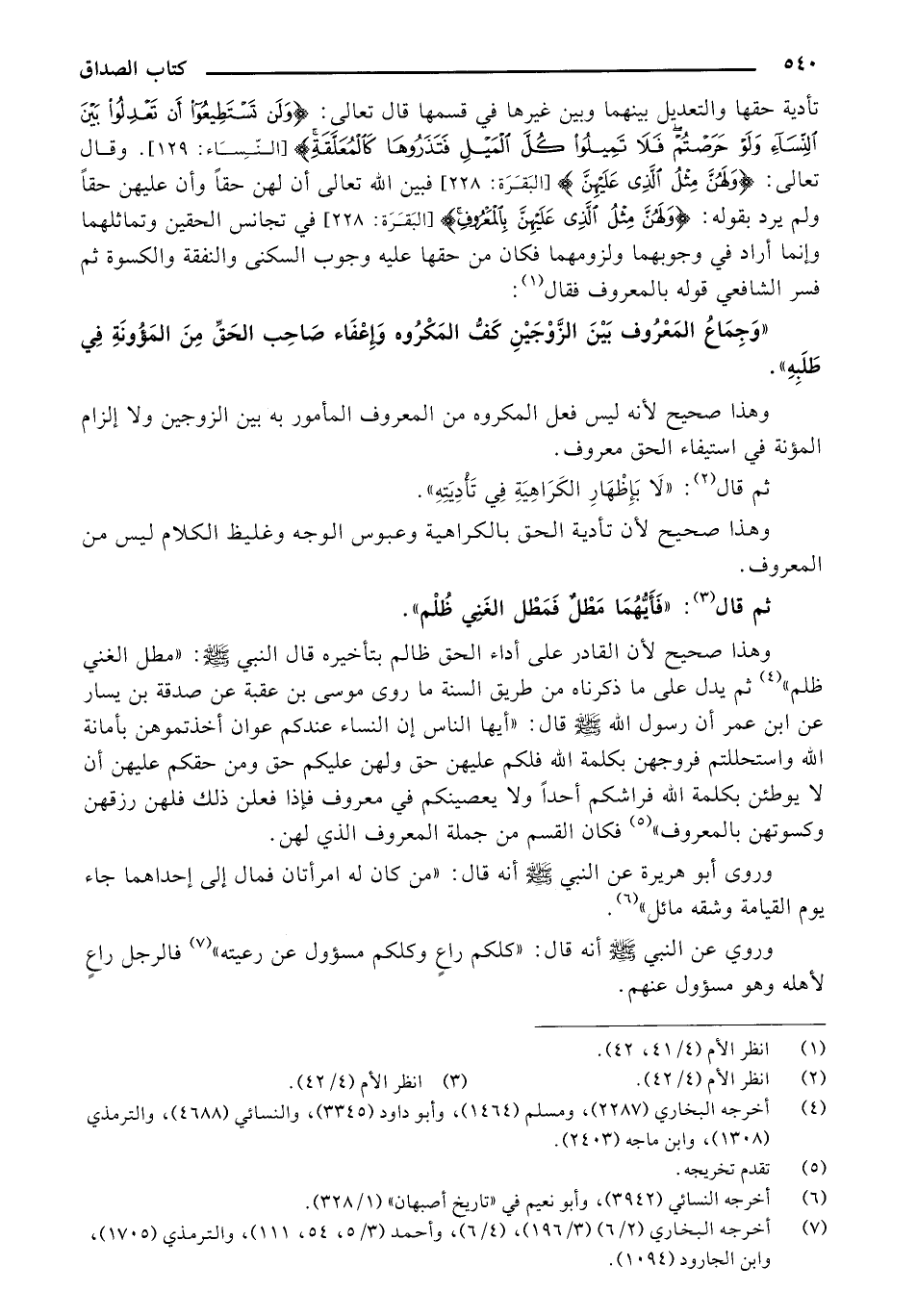 تأدية حقها والتعديل بينهما وبين غيرها في قسمها قال تعالى: {ولَن تَسْتَطِيعُوا أَن تَعْدِلُوا بَيْنَ النِّسَاءِ ولَوْ حَرَصْتُمْ فَلا تَمِيلُوا كُلَّ المَيْلِ فَتَذَرُوهَا كَالْمُعَلَّقَة} [النساء: (129)] وقال تعالى: {ولَهُنَّ مِثْلُ الَّذِي عَلَيْهِنَّ} [البقرة: (228)] فبين الله تعالى أن لهن حقا وأن عليهن حقا ولم يرد بقوله: {ولَهُنَّ مِثْلُ الَّذِي عَلَيْهِنَّ بِالْمَعْرُوفِ} [البقرة: (228)] في تجانس الحقين وتماثلهما وإنما أراد في وجوبهما ولزومهما فكان من حقها عليه وجوب السكنى والنفقة والكوة ثم فسر الشافعي قوله بالمعروف فقال: