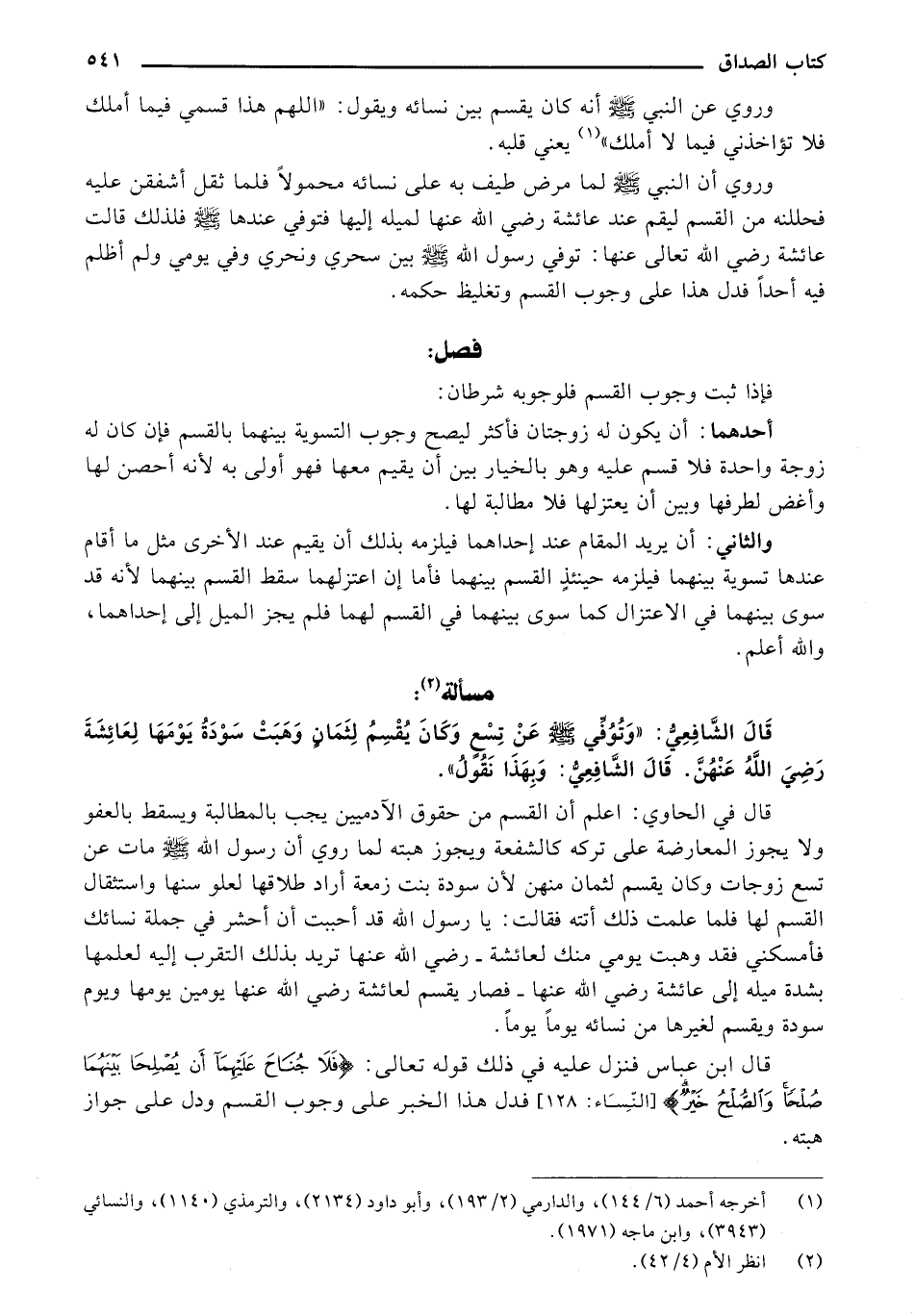 قَالَ الشَّافِعِيُّ: " تُوُفِّيَ رَسُولُ اللَّهِ صَلَّى اللَّهُ عَلَيْهِ وَسَلَّمَ عَنْ تِسْعِ نِسْوَةٍ، وَكَانَ يَقْسِمُ لِثَمَانٍ، وَهَبَتْ سَوْدَةَ يَوْمَهَا لِعَائِشَةَ رضي الله عنهن. قَالَ الشَّافِعِيُّ: وبهذا نقول".