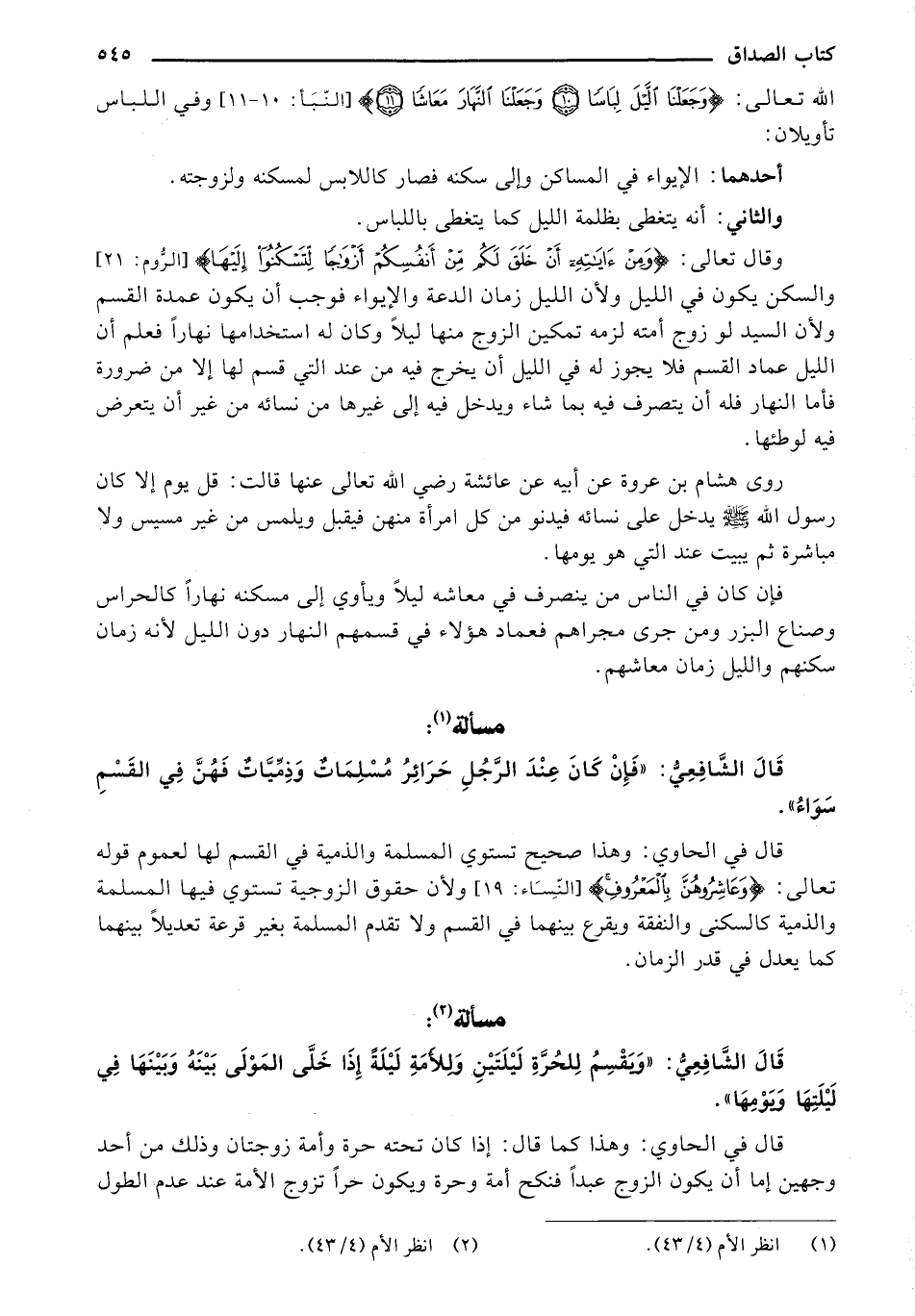 قَالَ الشَّافِعِيُّ: {يُقْسَمُ لِلْحُرَّةِ لَيْلَتَانِ وَلِلْأَمَةِ لَيْلَةٌ إِذَا خَلى المَوْلَى بَيْنُه وَبَيْنَهَا فِي لَيْلَتِهَا وَيَوْمِهَا}.
