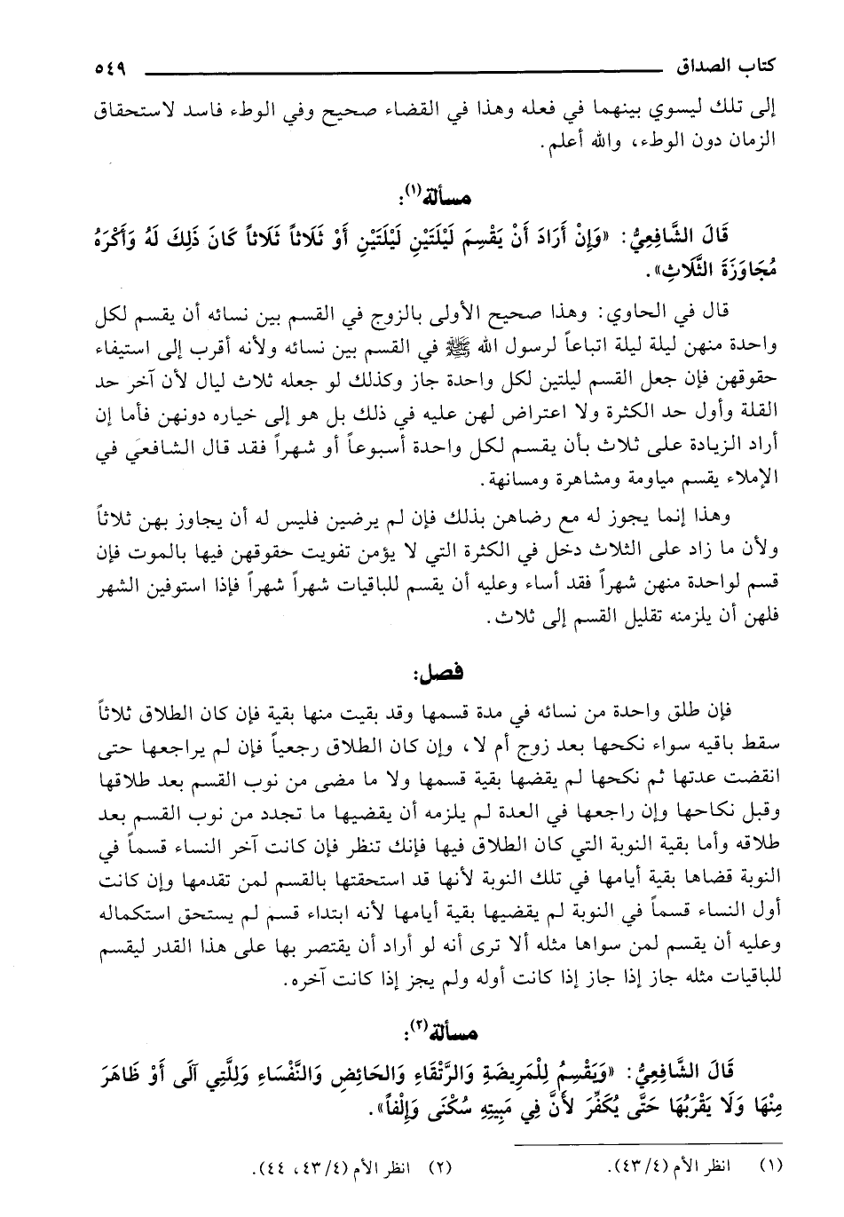 قَالَ الشَّافِعِيُّ: "وَإِنْ أَرَادَ أَنْ يَقْسِمَ لَيْلَتَيْنِ لَيْلَتَيْنِ أَوْ ثَلَاثاً ثَلَاثاً كَانَ ذَلِكَ لَهُ وَأَكْرَهُ مُجَاوَزَةَ الثلَاثِ ".