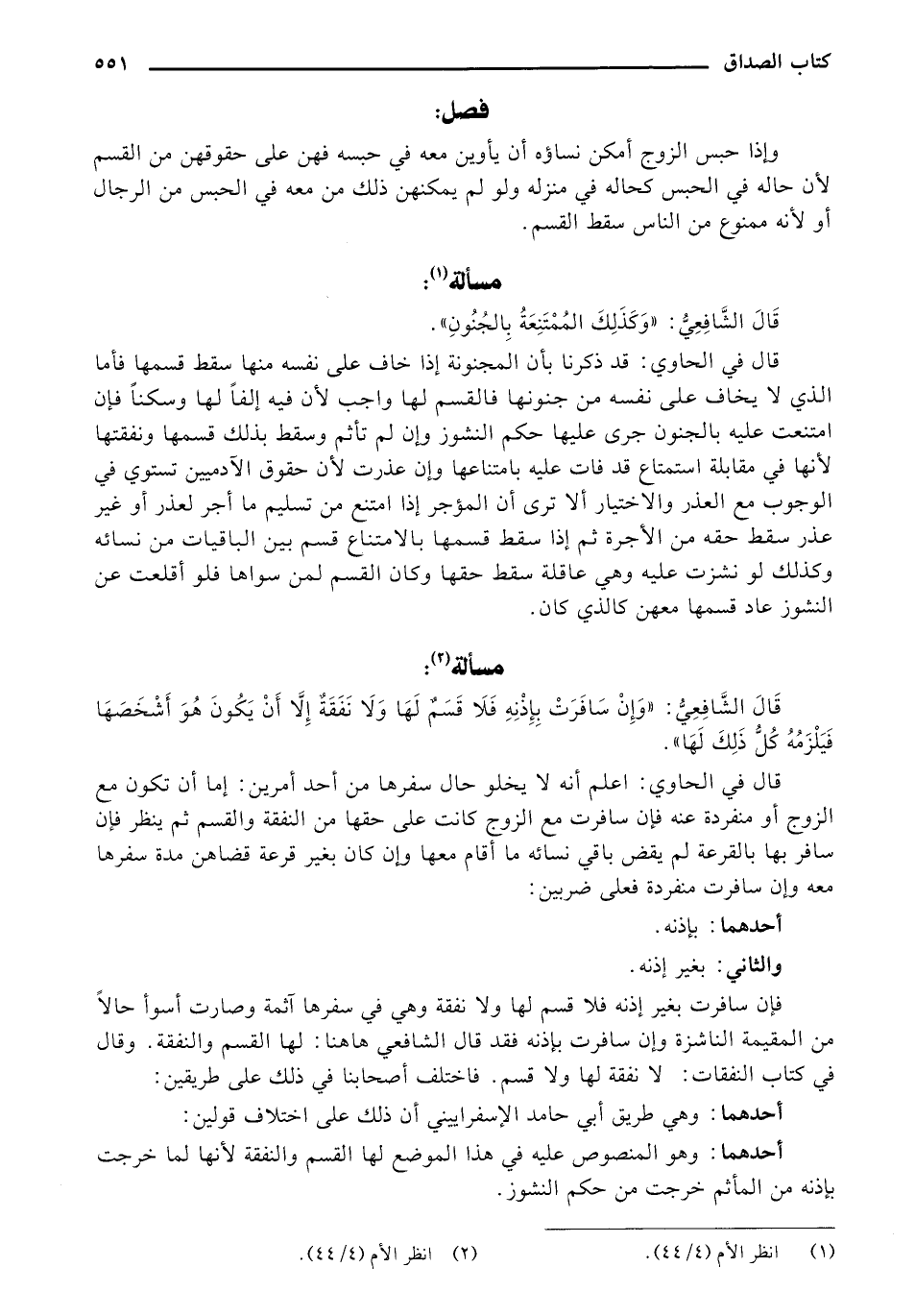 قال في الحاوي: اعلم أنه لا يخلو حال سفرها من أحد أمرين: إما أن تكون مع الزوج أو منفردة عنه فإن سافرت مع الزوج كانت على حقها من النفقة والقسم ثم ينظر فإن سافر بها بالقرعة لم يقض باقي نسائه ما أقام معها وإن كان بغير قرعة قضاهن مدة سفرها معه وإن سافرت منفردة فعلى ضربين: