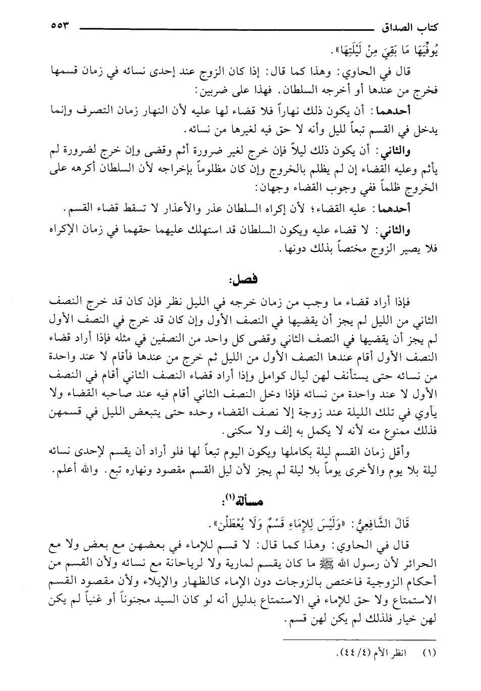 وأقل زمان القسم ليلة بكاملها ويكون اليوم تبعًا لها فلو أراد أن يقسم لإحدى نسائه ليلة بلا يوم والأخرى يومًا بلا ليلة لم يجز لأن ليل القسم مقصود ونهاره تبع. والله أعلم.