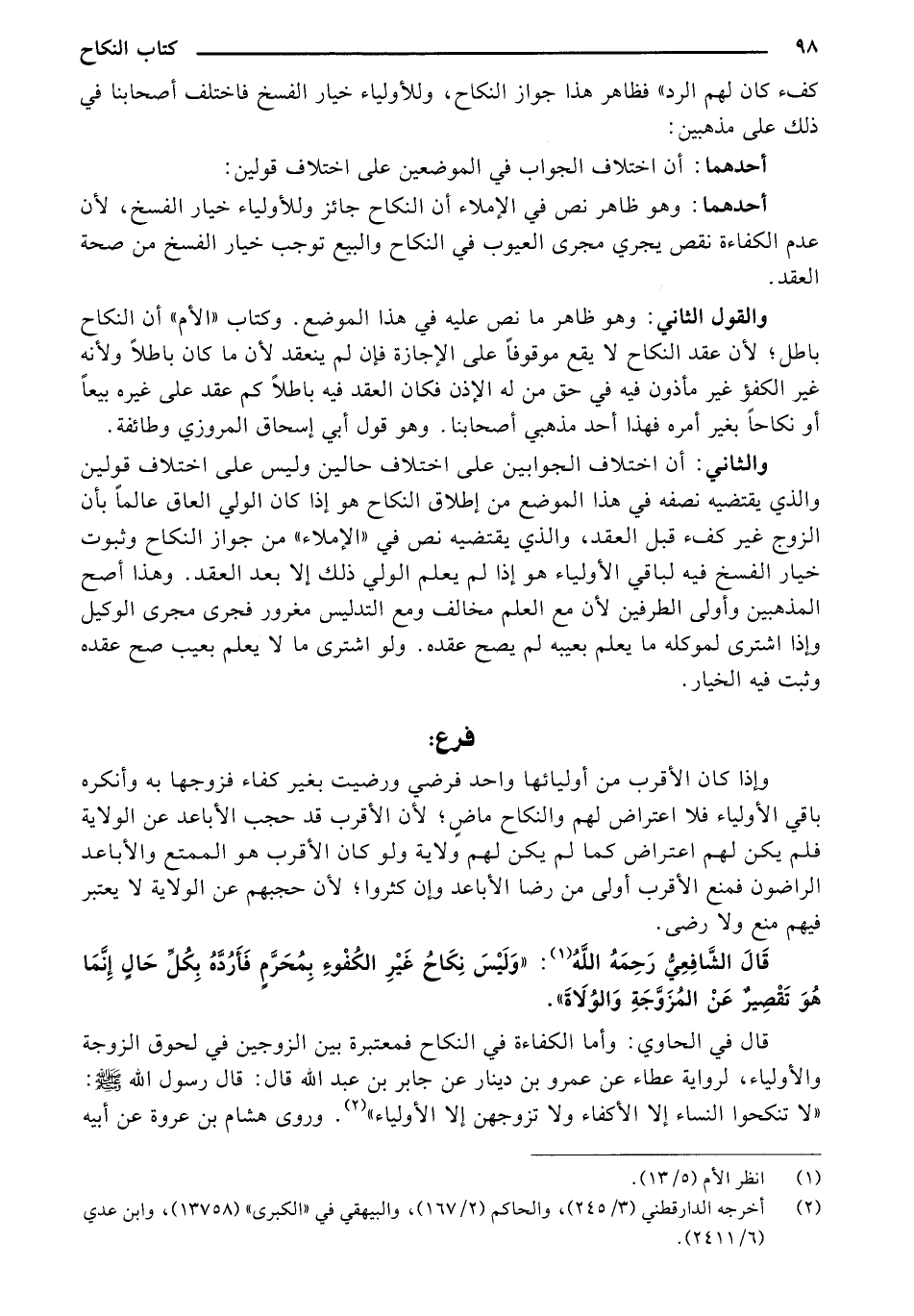 والثاني: أن اختلاف الجوابين على اختلاف حالين وليس على اختلاف قولين والذي يقتضيه نصفه في هذا الموضع من إطلاق النكاح هو إذا كان الولي العاق عالما بأن الزوج غير كفء قبل العقد، والذي يقتضيه نص في "الإملاء" من جواز النكاح وثبوت خيار الفسخ فيه لباقي الأولياء هو إذا لم يعلم الولي ذلك إلا بعد العقد. وهذا أصح المذهبين وأولى الطرفين لأن مع العلم مخالف ومع التدليس مغرور فجرى مجرى الوكيل وإذا اشترى لموكلة ما يعلم بعيبه لم يصح عقده. ولو اشترى ما لا يعلم بعيب صح عقده وثبت فيه الخيار.