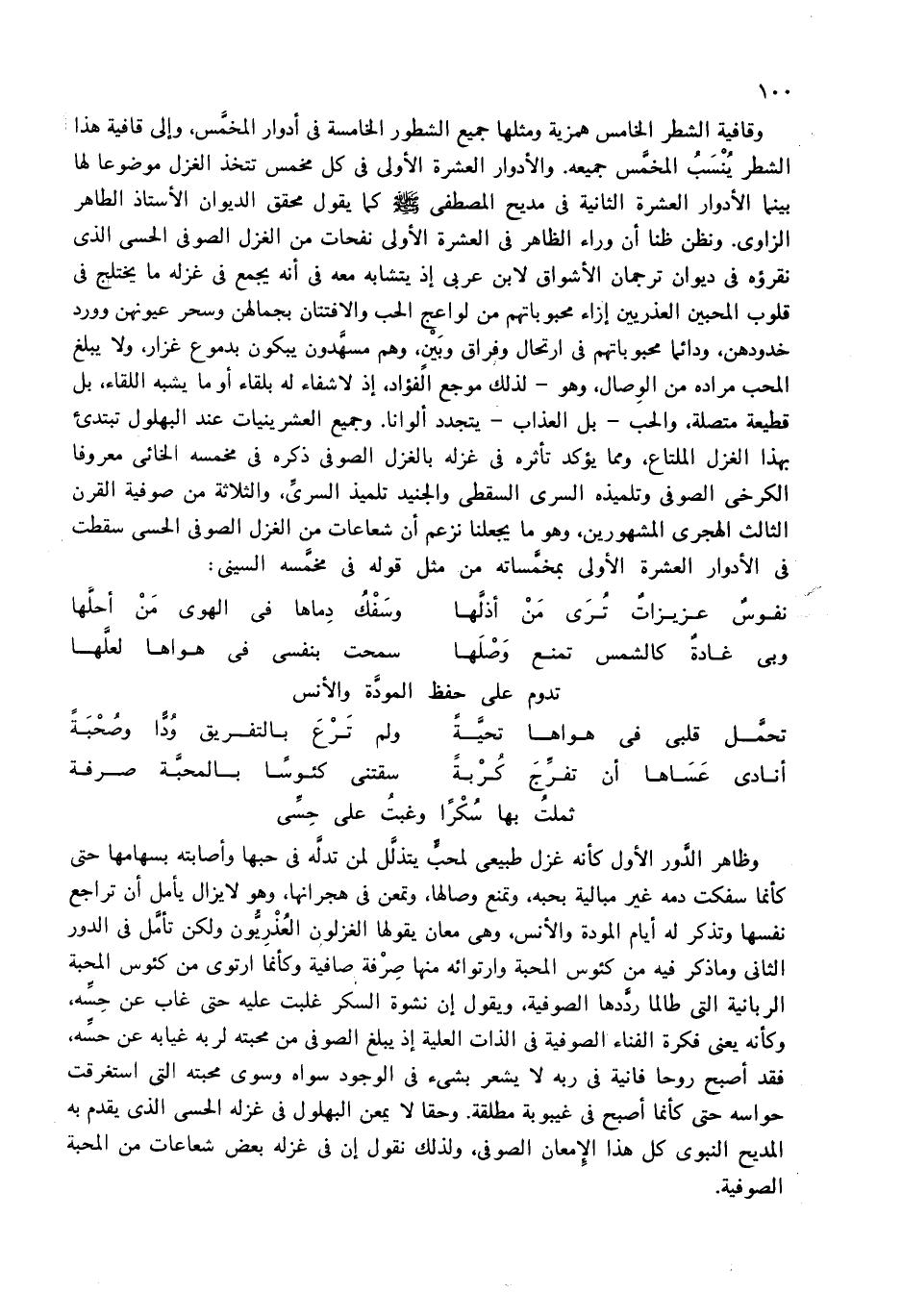 وظاهر الدّور الأول كأنه غزل طبيعى لمحبّ يتذلّل لمن تدلّه فى حبها وأصابته بسهامها حتى كأنما سفكت دمه غير مبالية بحبه، وتمنع وصالها، وتمعن فى هجرانها، وهو لا يزال يأمل أن تراجع نفسها وتذكر له أيام المودة والأنس، وهى معان يقولها الغزلون العذريّون ولكن تأمّل فى الدور الثانى وما ذكر فيه من كئوس المحبة وارتوائه منها صرفة صافية وكأنما ارتوى من كئوس المحبة الربانية التى طالما ردّدها الصوفية، ويقول إن نشوة السكر غلبت عليه حتى غاب عن حسّه، وكأنه يعنى فكرة الفناء الصوفية فى الذات العلية إذ يبلغ الصوفى من محبته لربه غيابه عن حسّه، فقد أصبح روحا فانية فى ربه لا يشعر بشئ فى الوجود سواه وسوى محبته التى استغرقت حواسه حتى كأنما أصبح فى غيبوبة مطلقة. وحقا لا يمعن البهلول فى غزله الحسى الذى يقدم به المديح النبوى كل هذا الإمعان الصوفى، ولذلك نقول إن فى غزله بعض شعاعات من المحبة الصوفية.