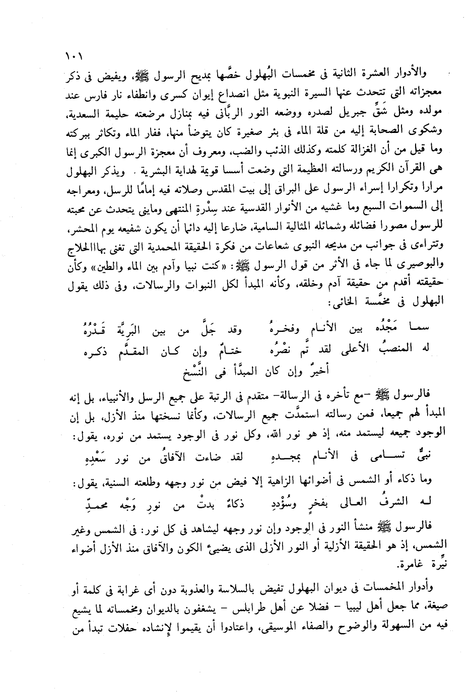 فالرسول صلّى الله عليه وسلّم منشأ النور فى الوجود وإن نور وجهه ليشاهد فى كل نور: فى الشمس وغير الشمس، إذ هو الحقيقة الأزلية أو النور الأزلى الذى يضيئ الكون والآفاق منذ الأزل أضواء نيّرة غامرة.