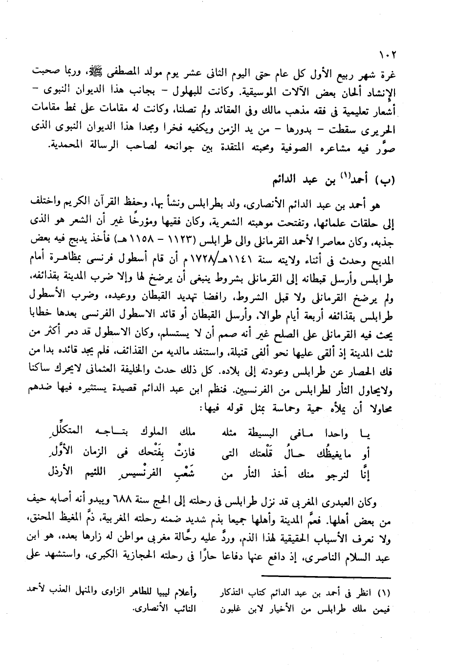 (¬1) انظر فى أحمد بن عبد الدائم كتاب التذكار فيمن ملك طرابلس من الأخيار لابن غلبون وأعلام ليبيا للطاهر الزاوى والمنهل العذب لأحمد النائب الأنصارى.