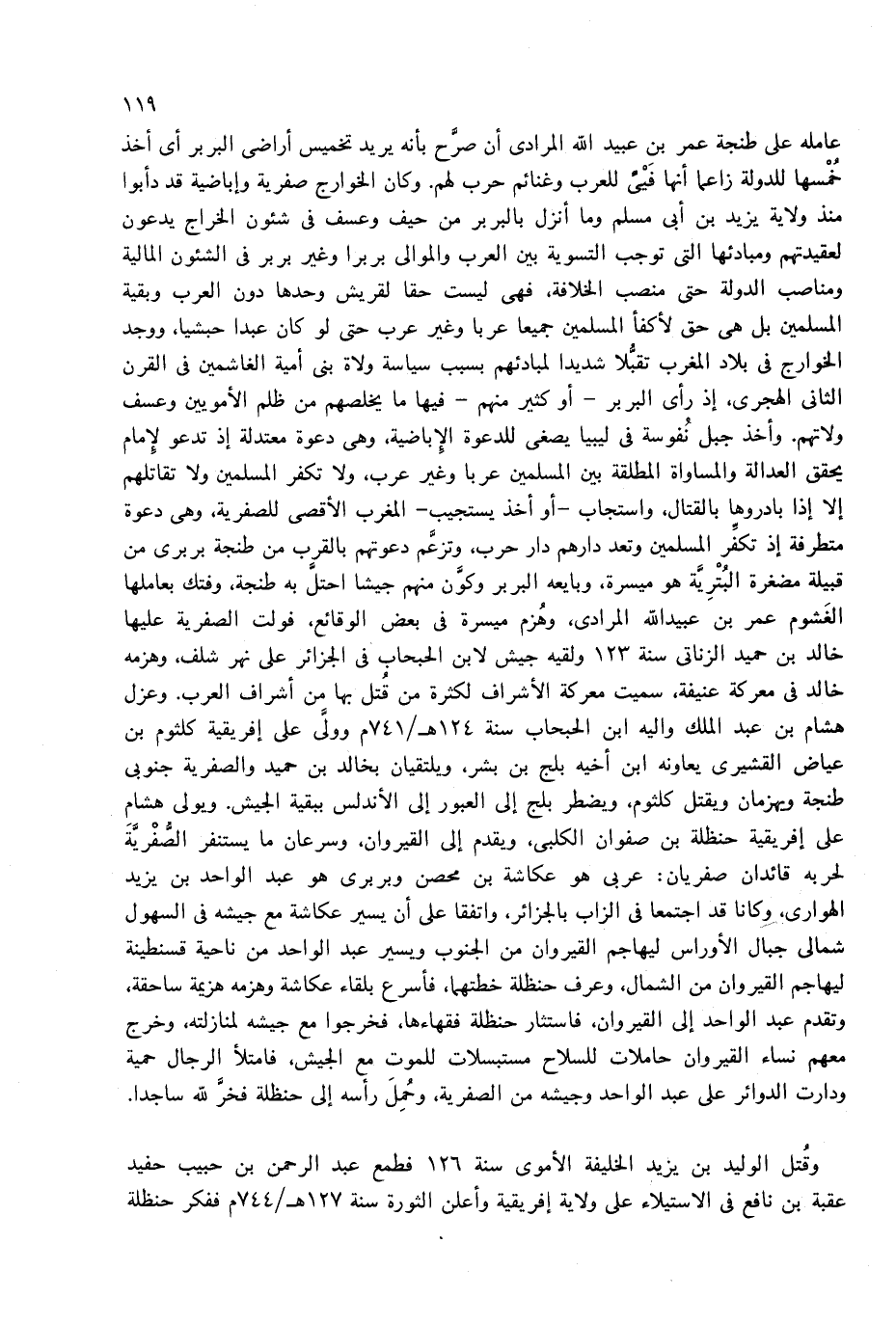 عامله على طنجة عمر بن عبيد الله المرادى أن صرّح بأنه يريد تخميس أراضى البربر أى أخذ خمسها للدولة زاعما أنها فيء للعرب وغنائم حرب لهم. وكان الخوارج صفرية وإباضية قد دأبوا منذ ولاية يزيد بن أبى مسلم وما أنزل بالبربر من حيف وعسف فى شئون الخراج يدعون لعقيدتهم ومبادئها التى توجب التسوية بين العرب والموالى بربرا وغير بربر فى الشئون المالية ومناصب الدولة حتى منصب الخلافة، فهى ليست حقا لقريش وحدها دون العرب وبقية المسلمين بل هى حق لأكفأ المسلمين جميعا عربا وغير عرب حتى لو كان عبدا حبشيا، ووجد الخوارج فى بلاد المغرب تقبّلا شديدا لمبادئهم بسبب سياسة ولاة بنى أمية الغاشمين فى القرن الثانى الهجرى، إذ رأى البربر-أو كثير منهم-فيها ما يخلصهم من ظلم الأمويين وعسف ولاتهم. وأخذ جبل نفوسة فى ليبيا يصغى للدعوة الإباضية، وهى دعوة معتدلة إذ تدعو لإمام يحقق العدالة والمساواة المطلقة بين المسلمين عربا وغير عرب، ولا تكفر المسلمين ولا تقاتلهم إلا إذا بادروها بالقتال، واستجاب-أو أخذ يستجيب-المغرب الأقصى للصفرية، وهى دعوة متطرفة إذ تكفّر المسلمين وتعد دارهم دار حرب، وتزعّم دعوتهم بالقرب من طنجة بربرى من قبيلة مضغرة البتريّة هو ميسرة، وبايعه البربر وكوّن منهم جيشا احتلّ به طنجة، وفتك بعاملها الغشوم عمر بن عبيد الله المرادى، وهزم ميسرة فى بعض الوقائع، فولت الصفرية عليها خالد بن حميد الزناتى سنة 123 ولقيه جيش لابن الحبحاب فى الجزائر على نهر شلف، وهزمه خالد فى معركة عنيفة، سميت معركة الأشراف لكثرة من قتل بها من أشراف العرب. وعزل هشام بن عبد الملك واليه ابن الحبحاب سنة 124 هـ/741 م وولّى على إفريقية كلثوم بن عياض القشيرى يعاونه ابن أخيه بلج بن بشر، ويلتقيان بخالد بن حميد والصفرية جنوبى طنجة ويهزمان ويقتل كلثوم، ويضطر بلج إلى العبور إلى الأندلس ببقية الجيش. ويولى هشام على إفريقية حنظلة بن صفوان الكلبى، ويقدم إلى القيروان، وسرعان ما يستنفر الصّفريّة لحربه قائدان صفريان: عربى هو عكاشة بن محصن وبربرى هو عبد الواحد بن يزيد الهوارى، وكانا قد اجتمعا فى الزاب بالجزائر، واتفقا على أن يسير عكاشة مع جيشه فى السهول شمالى جبال الأوراس ليهاجم القيروان من الجنوب ويسير عبد الواحد من ناحية قسنطينة ليهاجم القيروان من الشمال، وعرف حنظلة خطتهما، فأسرع بلقاء عكاشة وهزمه هزيمة ساحقة، وتقدم عبد الواحد إلى القيروان، فاستثار حنظلة فقهاءها، فخرجوا مع جيشه لمنازلته، وخرج معهم نساء القيروان حاملات للسلاح مستبسلات للموت مع الجيش، فامتلأ الرجال حمية ودارت الدوائر على عبد الواحد وجيشه من الصفرية، وحمل رأسه إلى حنظلة فخرّ لله ساجدا.