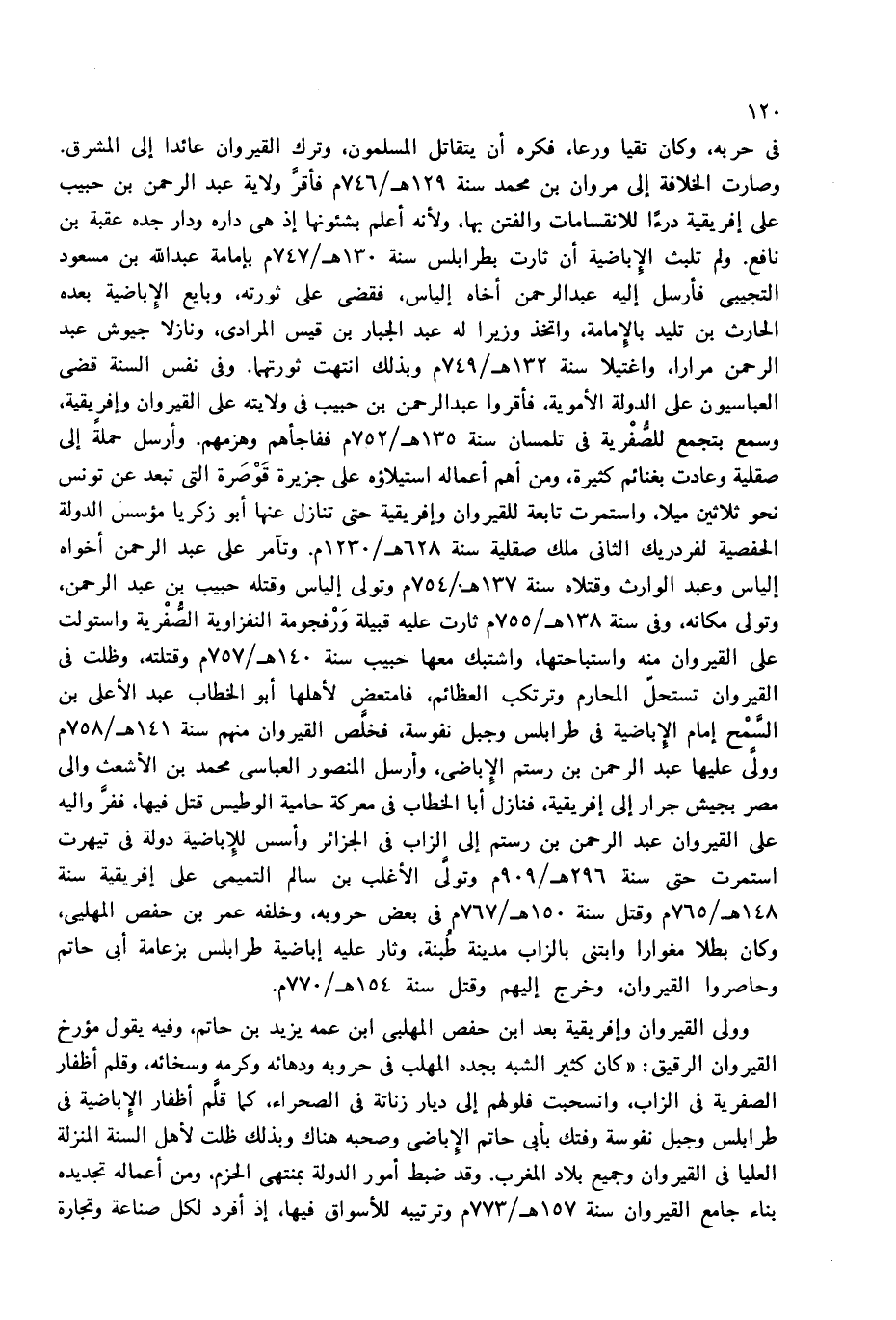 وصارت الخلافة إلى مروان بن محمد سنة 129 هـ/746 م فأقرّ ولاية عبد الرحمن بن حبيب على إفريقية درءا للانقسامات والفتن بها، ولأنه أعلم بشئونها إذ هى داره ودار جده عقبة بن نافع. ولم تلبث الإباضية أن ثارت بطرابلس سنة 130 هـ/747 م بإمامة عبد الله بن مسعود التجيبى فأرسل إليه عبد الرحمن أخاه إلياس، فقضى على ثورته، وبايع الإباضية بعده الحارث بن تليد بالإمامة، واتخذ وزيرا له عبد الجبار بن قيس المرادى، ونازلا جيوش عبد الرحمن مرارا، واغتيلا سنة 132 هـ/749 م وبذلك انتهت ثورتهما. وفى نفس السنة قضى العباسيون على الدولة الأموية، فأقروا عبد الرحمن بن حبيب فى ولايته على القيروان وإفريقية، وسمع بتجمع للصّفرية فى تلمسان سنة 135 هـ/752 م ففاجأهم وهزمهم. وأرسل حملة إلى صقلية وعادت بغنائم كثيرة، ومن أهم أعماله استيلاؤه على جزيرة قوصرة التى تبعد عن تونس نحو ثلاثين ميلا، واستمرت تابعة للقيروان وإفريقية حتى تنازل عنها أبو زكريا مؤسس الدولة الحفصية لفردريك الثانى ملك صقلية سنة 628 هـ/1230 م. وتآمر على عبد الرحمن أخواه إلياس وعبد الوارث وقتلاه سنة 137 هـ/754 م وتولى إلياس وقتله حبيب بن عبد الرحمن، وتولى مكانه، وفى سنة 138 هـ/755 م ثارت عليه قبيلة ورفجومة النفزاوية الصّفرية واستولت على القيروان منه واستباحتها، واشتبك معها حبيب سنة 140 هـ/757 م وقتلته، وظلت فى القيروان تستحلّ المحارم وترتكب العظائم، فامتعض لأهلها أبو الخطاب عبد الأعلى بن السّمح إمام الإباضية فى طرابلس وجبل نفوسة، فخلّص القيروان منهم سنة 141 هـ/758 م وولّى عليها عبد الرحمن بن رستم الإباضى، وأرسل المنصور العباسى محمد بن الأشعث والى مصر بجيش جرار إلى إفريقية، فنازل أبا الخطاب فى معركة حامية الوطيس قتل فيها، ففرّ واليه على القيروان عبد الرحمن بن رستم إلى الزاب فى الجزائر وأسس للإباضية دولة فى تيهرت استمرت حتى سنة 296 هـ/909 م وتولّى الأغلب بن سالم التميمى على إفريقية سنة 148 هـ/765 م وقتل سنة 150 هـ/767 م فى بعض حروبه، وخلفه عمر بن حفص المهلبي، وكان بطلا مغوارا وابتنى بالزاب مدينة طبنة، وثار عليه إباضية طرابلس بزعامة أبى حاتم وحاصروا القيروان، وخرج إليهم وقتل سنة 154 هـ/770 م.