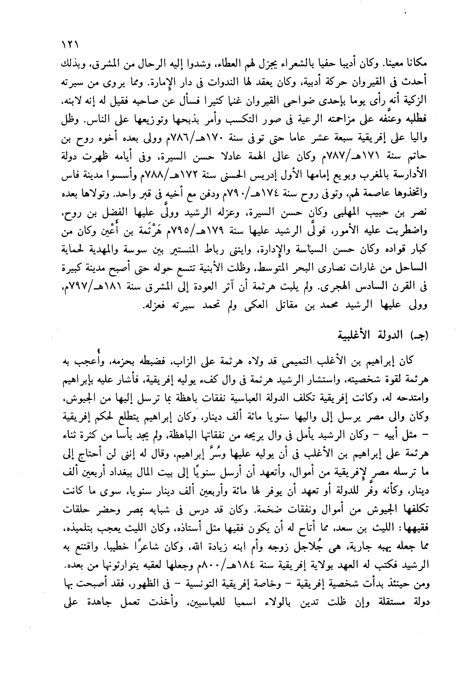 مكانا معينا. وكان أديبا حفيا بالشعراء يجزل لهم العطاء، وشدوا إليه الرحال من المشرق، وبذلك أحدث فى القيروان حركة أدبية، وكان يعقد لها الندوات فى دار الإمارة. ومما يروى من سيرته الزكية أنه رأى يوما بإحدى ضواحى القيروان غنما كثيرا فسأل عن صاحبه فقيل له إنه لابنه، فطلبه وعنّفه على مزاحمته الرعية فى صور التكسب وأمر بذبحها وتوزيعها على الناس. وظل واليا على إفريقية سبعة عشر عاما حتى توفى سنة 170 هـ/786 م وولى بعده أخوه روح بن حاتم سنة 171 هـ/787 م وكان عالى الهمة عادلا حسن السيرة، وفى أيامه ظهرت دولة الأدارسة بالمغرب وبويع إمامها الأول إدريس الحسنى سنة 172 هـ/788 م وأسسوا مدينة فاس واتخذوها عاصمة لهم، وتوفى روح سنة 174 هـ/790 م ودفن مع أخيه فى قبر واحد. وتولاها بعده نصر بن حبيب المهلبى وكان حسن السيرة، وعزله الرشيد وولّى عليها الفضل بن روح، واضطربت عليه الأمور، فولّى الرشيد عليها سنة 179 هـ/795 م هرثمة بن أعين وكان من كبار قواده وكان حسن السياسة والإدارة، وايتنى رباط المنستير بين سوسة والمهدية لحماية الساحل من غارات نصارى البحر المتوسط، وظلت الأبنية تتسع حوله حتى أصبح مدينة كبيرة فى القرن السادس الهجرى. ولم يلبث هرثمة أن آثر العودة إلى المشرق سنة 181 هـ/797 م، وولى عليها الرشيد محمد بن مقاتل العكى ولم تحمد سيرته فعزله.