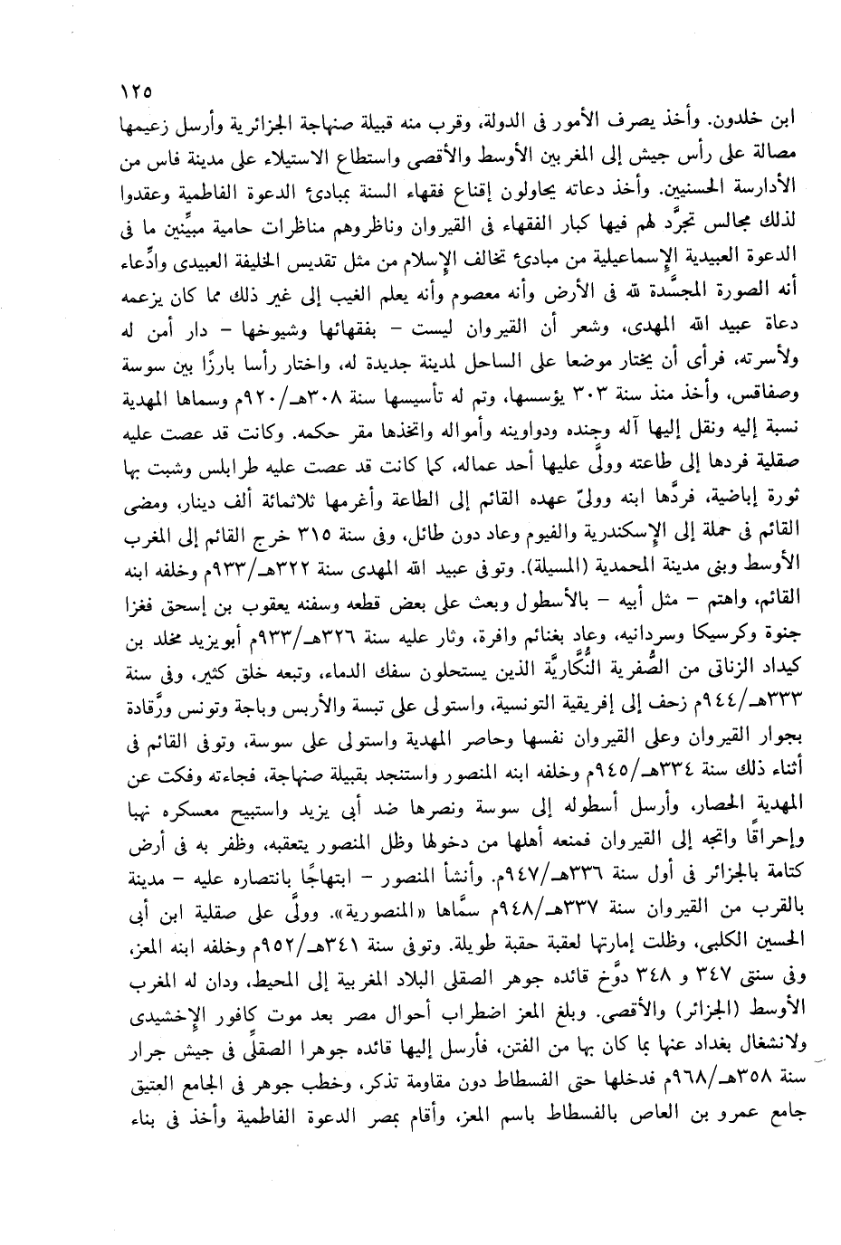 ابن خلدون. وأخذ يصرف الأمور فى الدولة، وقرب منه قبيلة صنهاجة الجزائرية وأرسل زعيمها مصالة على رأس جيش إلى المغربين الأوسط والأقصى واستطاع الاستيلاء على مدينة فاس من الأدارسة الحسنيين. وأخذ دعاته يحاولون إقناع فقهاء السنة بمبادئ الدعوة الفاطمية وعقدوا لذلك مجالس تجرّد لهم فيها كبار الفقهاء فى القيروان وناظروهم مناظرات حامية مبيّنين ما فى الدعوة العبيدية الإسماعيلية من مبادئ تخالف الإسلام من مثل تقديس الخليفة العبيدى وادّعاء أنه الصورة المجسّدة لله فى الأرض وأنه معصوم وأنه يعلم الغيب إلى غير ذلك مما كان يزعمه دعاة عبيد الله المهدى، وشعر أن القيروان ليست-بفقهائها وشيوخها-دار أمن له ولأسرته، فرأى أن يختار موضعا على الساحل لمدينة جديدة له، واختار رأسا بارزا بين سوسة وصفاقس، وأخذ منذ سنة 303 يؤسسها، وتم له تأسيسها سنة 308 هـ/920 م وسماها المهدية نسبة إليه ونقل إليها آله وجنده ودواوينه وأمواله واتخذها مقر حكمه. وكانت قد عصت عليه صقلية فردها إلى طاعته وولّى عليها أحد عماله، كما كانت قد عصت عليه طرابلس وشبت بها ثورة إباضية، فردّها ابنه وولىّ عهده القائم إلى الطاعة وأغرمها ثلاثمائة ألف دينار، ومضى القائم فى حملة إلى الإسكندرية والفيوم وعاد دون طائل، وفى سنة 315 خرج القائم إلى المغرب الأوسط وبنى مدينة المحمدية (المسيلة). وتوفى عبيد الله المهدى سنة 322 هـ/933 م وخلفه ابنه القائم، واهتم-مثل أبيه-بالأسطول وبعث على بعض قطعه وسفنه يعقوب بن إسحاق فغزا جنوة وكرسيكا وسردانيه، وعاد بغنائم وافرة، وثار عليه سنة 326 هـ/933 م أبو يزيد مخلد بن كيداد الزناتى من الصّفرية النّكّاريّة الذين يستحلون سفك الدماء، وتبعه خلق كثير، وفى سنة 333 هـ/944 م زحف إلى إفريقية التونسية، واستولى على تبسة والأربس وباجة وتونس ورقادة بجوار القيروان وعلى القيروان نفسها وحاصر المهدية واستولى على سوسة، وتوفى القائم فى أثناء ذلك سنة 334 هـ/945 م وخلفه ابنه المنصور واستنجد بقبيلة صنهاجة، فجاءته وفكت عن المهدية الحصار، وأرسل أسطوله إلى سوسة ونصرها ضد أبى يزيد واستبيح معسكره نهبا وإحراقا واتجه إلى القيروان فمنعه أهلها من دخولها وظل المنصور يتعقبه، وظفر به فى أرض كتامة بالجزائر فى أول سنة 336 هـ/947 م. وأنشأ المنصور-ابتهاجا بانتصاره عليه-مدينة بالقرب من القيروان سنة 337 هـ/948 م سمّاها «المنصورية». وولّى على صقلية ابن أبى الحسين الكلبى، وظلت إمارتها لعقبة حقبة طويلة. وتوفى سنة 341 هـ/952 م وخلفه ابنه المعز، وفى سنتى 347 و 348 دوّخ قائده جوهر الصقلى البلاد المغربية إلى المحيط، ودان له المغرب الأوسط (الجزائر) والأقصى. وبلغ المعز اضطراب أحوال مصر بعد موت كافور الإخشيدى ولانشغال بغداد عنها بما كان بها من الفتن، فأرسل إليها قائده جوهرا الصقلّى فى جيش جرار سنة 358 هـ/968 م فدخلها حتى الفسطاط دون مقاومة تذكر، وخطب جوهر فى الجامع العتيق جامع عمرو بن العاص بالفسطاط باسم المعز، وأقام بمصر الدعوة الفاطمية وأخذ فى بناء