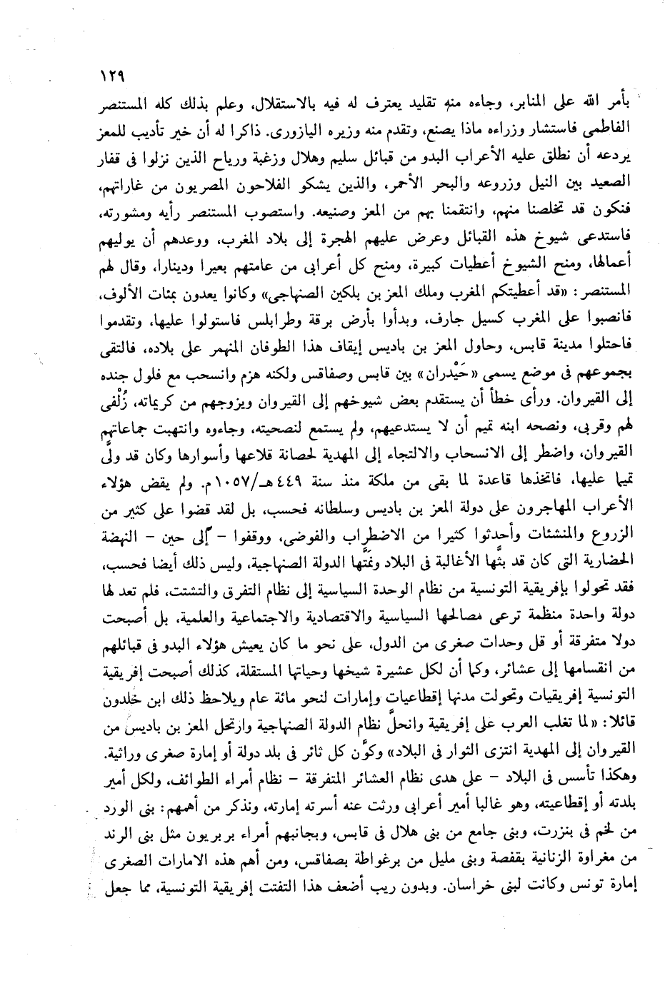 بأمر الله على المنابر، وجاءه منه تقليد يعترف له فيه بالاستقلال، وعلم بذلك كله المستنصر الفاطمى فاستشار وزراءه ماذا يصنع، وتقدم منه وزيره اليازورى. ذاكرا له أن خير تأديب للمعز يردعه أن نطلق عليه الأعراب البدو من قبائل سليم وهلال وزغبة ورياح الذين نزلوا فى قفار الصعيد بين النيل وزروعه والبحر الأحمر، والذين يشكو الفلاحون المصريون من غاراتهم، فنكون قد تخلصنا منهم، وانتقمنا بهم من المعز وصنيعه. واستصوب المستنصر رأيه ومشورته، فاستدعى شيوخ هذه القبائل وعرض عليهم الهجرة إلى بلاد المغرب، ووعدهم أن يوليهم أعمالها، ومنح الشيوخ أعطيات كبيرة، ومنح كل أعرابى من عامتهم بعيرا ودينارا، وقال لهم المستنصر: «قد أعطيتكم المغرب وملك المعز بن بلكين الصنهاجى» وكانوا يعدون بمئات الألوف، فانصبوا على المغرب كسيل جارف، وبدءوا بأرض برقة وطرابلس فاستولوا عليها، وتقدموا فاحتلوا مدينة قابس، وحاول المعز بن باديس إيقاف هذا الطوفان المنهمر على بلاده، فالتقى بجموعهم فى موضع يسمى «حيدران» بين قابس وصفاقس ولكنه هزم وانسحب مع فلول جنده إلى القيروان. ورأى خطأ أن يستقدم بعض شيوخهم إلى القيروان ويزوجهم من كريماته، زلفى لهم وقربى، ونصحه ابنه تميم أن لا يستدعيهم، ولم يستمع لنصحيته، وجاءوه وانتهبت جماعاتهم القيروان، واضطر إلى الانسحاب والالتجاء إلى المهدية لحصانة قلاعها وأسوارها وكان قد ولّى تميما عليها، فاتخذها قاعدة لما بقى من ملكة منذ سنة 449 هـ/1057 م. ولم يقض هؤلاء الأعراب المهاجرون على دولة المعز بن باديس وسلطانه فحسب، بل لقد قضوا على كثير من الزروع والمنشئات وأحدثوا كثيرا من الاضطراب والفوضى، ووقفوا-إلى حين-النهضة الحضارية التى كان قد بثّها الأغالبة فى البلاد ونمتّها الدولة الصنهاجية، وليس ذلك أيضا فحسب، فقد تحولوا بإفريقية التونسية من نظام الوحدة السياسية إلى نظام التفرق والتشتت، فلم تعد لها دولة واحدة منظمة ترعى مصالحها السياسية والاقتصادية والاجتماعية والعلمية، بل أصبحت دولا متفرقة أو قل وحدات صغرى من الدول، على نحو ما كان يعيش هؤلاء البدو فى قبائلهم من انقسامها إلى عشائر، وكما أن لكل عشيرة شيخها وحياتها المستقلة، كذلك أصبحت إفريقية التونسية إفريقيات وتحولت مدنها إقطاعيات وإمارات لنحو مائة عام ويلاحظ ذلك ابن خلدون قائلا: «لما تغلب العرب على إفريقية وانحلّ نظام الدولة الصنهاجية وارتحل المعز بن باديس من القيروان إلى المهدية انتزى الثوار فى البلاد» وكوّن كل ثائر فى بلد دولة أو إمارة صغرى وراثية.