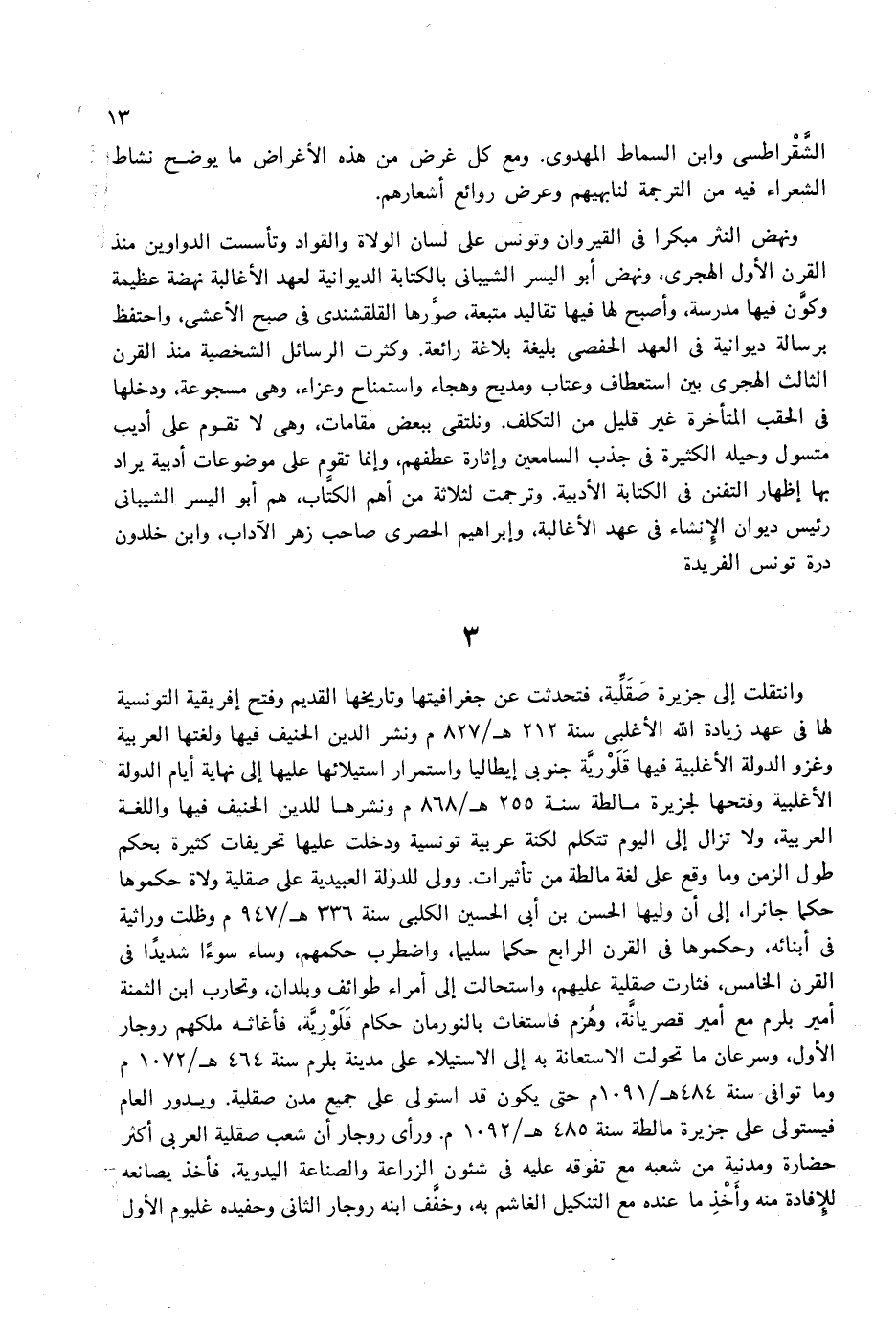 وانتقلت إلى جزيرة صقلّية، فتحدثت عن جغرافيتها وتاريخها القديم وفتح إفريقية التونسية لها فى عهد زيادة الله الأغلبى سنة 212 هـ/827 م ونشر الدين الحنيف فيها ولغتها العربية وغزو الدولة الأغلبية فيها قلوريّة جنوبى إبطاليا واستمرار استيلائها عليها إلى نهاية أيام الدولة الأغلبية وفتحها لجزيرة مالطة سنة 255 هـ/868 م ونشرها للدين الحنيف فيها واللغة العربية، ولا تزال إلى اليوم تتكلم لكنة عربية تونسية ودخلت عليها تحريفات كثيرة بحكم طول الزمن وما وقع على لغة مالطة من تأثيرات. وولى للدولة العبيدية على صقلية ولاة حكموها حكما جائرا، إلى أن وليها الحسن بن أبى الحسين الكلبى سنة 336 هـ/947 م وظلت وراثية فى أبنائه، وحكموها فى القرن الرابع حكما سليما، واضطرب حكمهم، وساء سوءا شديدا فى القرن الخامس، فثارت صقلية عليهم، واستحالت إلى أمراء طوائف وبلدان، وتحارب ابن الثمنة أمير بلرم مع أمير قصريانة، وهزم فاستغاث بالنورمان حكام قلوريّة، فأغاثه ملكهم روجار الأول، وسرعان ما تحولت الاستعانة به إلى الاستيلاء على مدينة بلرم سنة 464 هـ/1072 م وما توافى سنة 484 هـ/1091 م حتى يكون قد استولى على جميع مدن صقلية. ويدور العام فيستولى على جزيرة مالطة سنة 485 هـ/1092 م. ورأى روجار أن شعب صقلية العربى أكثر حضارة ومدنية من شعبه مع تفوقه عليه فى شئون الزراعة والصناعة اليدوية، فأخذ يصانعه للإفادة منه وأخذ ما عنده مع التنكيل الغاشم به، وخفّف ابنه روجار الثانى وحفيده غليوم الأول