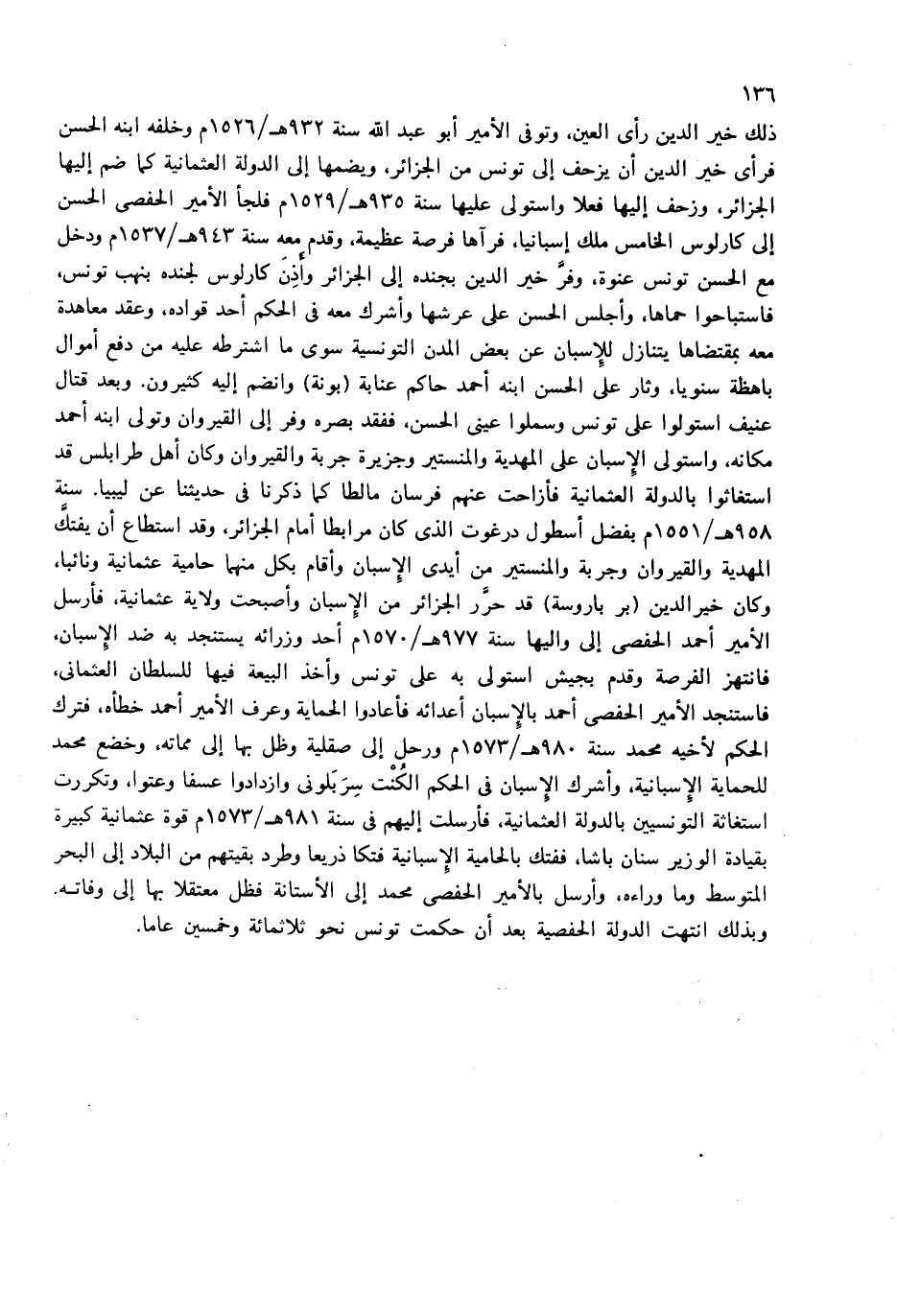 ذلك خير الدين رأى العين، وتوفى الأمير أبو عبد الله سنة 932 هـ/1526 م وخلفه ابنه الحسن فرأى خير الدين أن يزحف إلى تونس من الجزائر، ويضمها إلى الدولة العثمانية كما ضم إليها الجزائر، وزحف إليها فعلا واستولى عليها سنة 935 هـ/1529 م فلجأ الأمير الحفصى الحسن إلى كارلوس الخامس ملك إسبانيا، فرآها فرصة عظيمة، وقدم معه سنة 943 هـ/1537 م ودخل مع الحسن تونس عنوة، وفرّ خير الدين بجنده إلى الجزائر وأذن كارلوس لجنده بنهب تونس، فاستباحوا حماها، وأجلس الحسن على عرشها وأشرك معه فى الحكم أحد قواده، وعقد معاهدة معه بمقتضاها يتنازل للإسبان عن بعض المدن التونسية سوى ما اشترطه عليه من دفع أموال باهظة سنويا، وثار على الحسن ابنه أحمد حاكم عنابة (بونة) وانضم إليه كثيرون. وبعد قتال عنيف استولوا على تونس وسملوا عينى الحسن، ففقد بصره وفر إلى القيروان وتولى ابنه أحمد مكانه، واستولى الإسبان على المهدية والمنستير وجزيرة جربة والقيروان وكان أهل طرابلس قد استغاثوا بالدولة العثمانية فأزاحت عنهم فرسان مالطا كما ذكرنا فى حديثنا عن ليبيا. سنة 958 هـ/1551 م بفضل أسطول درغوت الذى كان مرابطا أمام الجزائر، وقد استطاع أن يفتكّ المهدية والقيروان وجربة والمنستير من أيدى الإسبان وأقام بكل منهما حامية عثمانية ونائبا، وكان خير الدين (بر باروسة) قد حرّر الجزائر من الإسبان وأصبحت ولاية عثمانية، فأرسل الأمير أحمد الحفصى إلى واليها سنة 977 هـ/1570 م أحد وزرائه يستنجد به ضد الإسبان، فانتهز الفرصة وقدم بجيش استولى به على تونس وأخذ البيعة فيها للسلطان العثمانى، فاستنجد الأمير الحفصى أحمد بالإسبان أعدائه فأعادوا الحماية وعرف الأمير أحمد خطأه، فترك الحكم لأخيه محمد سنة 980 هـ/1573 م ورحل إلى صقلية وظل بها إلى مماته، وخضع محمد للحماية الإسبانية، وأشرك الإسبان فى الحكم الكنت سربلونى وازدادوا عسفا وعتوا، وتكررت استغاثة التونسيين بالدولة العثمانية، فأرسلت إليهم فى سنة 981 هـ/1573 م قوة عثمانية كبيرة بقيادة الوزير سنان باشا، ففتك بالحامية الإسبانية فتكا ذريعا وطرد بقيتهم من البلاد إلى البحر المتوسط وما وراءه، وأرسل بالأمير الحفصى محمد إلى الأستانة فظل معتقلا بها إلى وفاته.