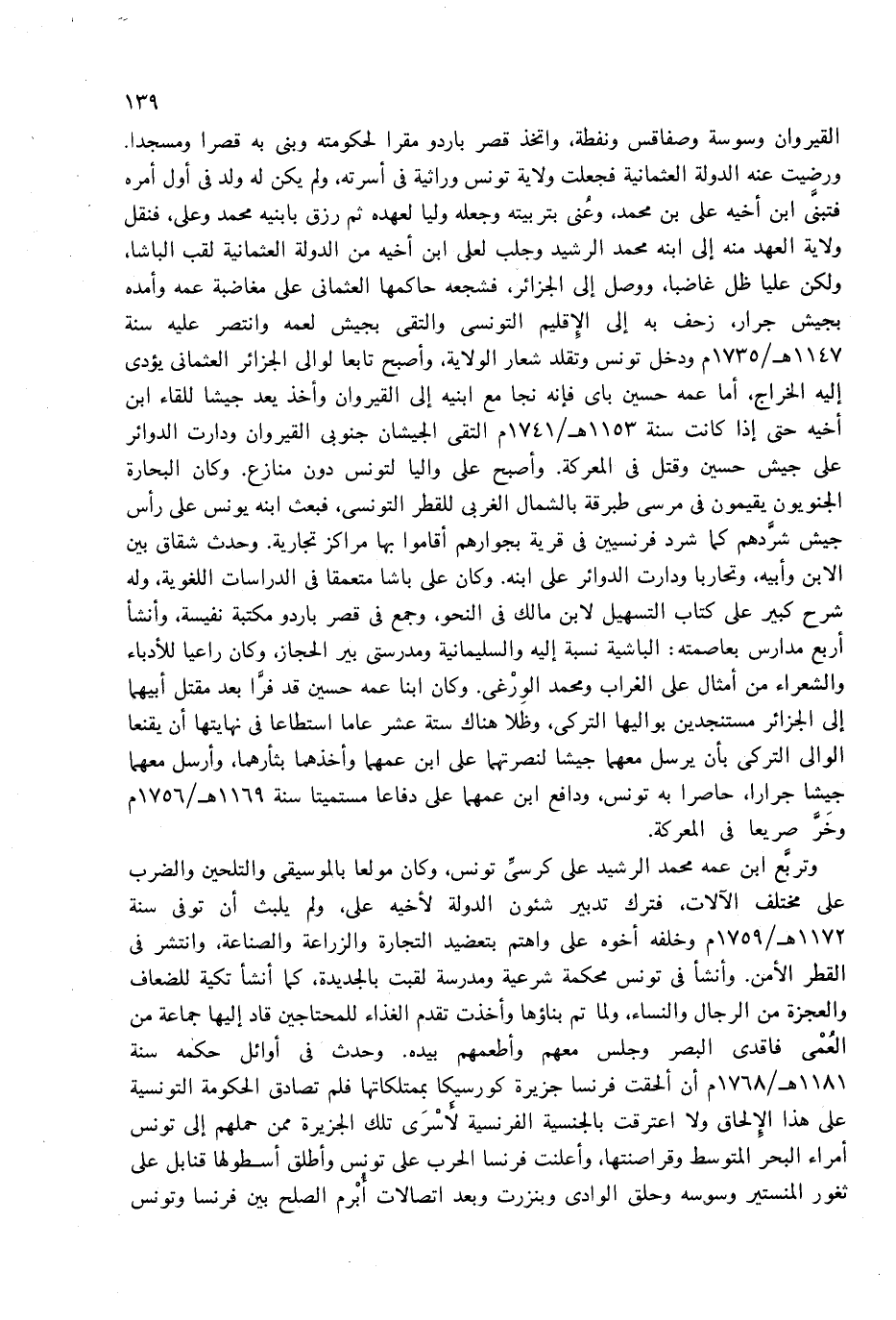 وتربّع ابن عمه محمد الرشيد على كرسىّ تونس، وكان مولعا بالموسيقى والتلحين والضرب على مختلف الآلات، فترك تدبير شئون الدولة لأخيه على، ولم يلبث أن توفى سنة 1172 هـ/1759 م وخلفه أخوه على واهتم بتعضيد التجارة والزراعة والصناعة، وانتشر فى القطر الأمن. وأنشأ فى تونس محكمة شرعية ومدرسة لقبت بالجديدة، كما أنشأ تكية للضعاف والعجزة من الرجال والنساء، ولما تم بناؤها وأخذت تقدم الغذاء للمحتاجين قاد إليها جماعة من العمى فاقدى البصر وجلس معهم وأطعمهم بيده. وحدث فى أوائل حكمه سنة 1181 هـ/1768 م أن ألحقت فرنسا جزيرة كورسيكا بممتلكاتها فلم تصادق الحكومة التونسية على هذا الإلحاق ولا اعترقت بالجنسية الفرنسية لأسرى تلك الجزيرة ممن حملهم إلى تونس أمراء البحر المتوسط وقراصنتها، وأعلنت فرنسا الحرب على تونس وأطلق أسطولها قنابل على ثغور المنستير وسوسه وحلق الوادى وبنزرت وبعد اتصالات أبرم الصلح بين فرنسا وتونس