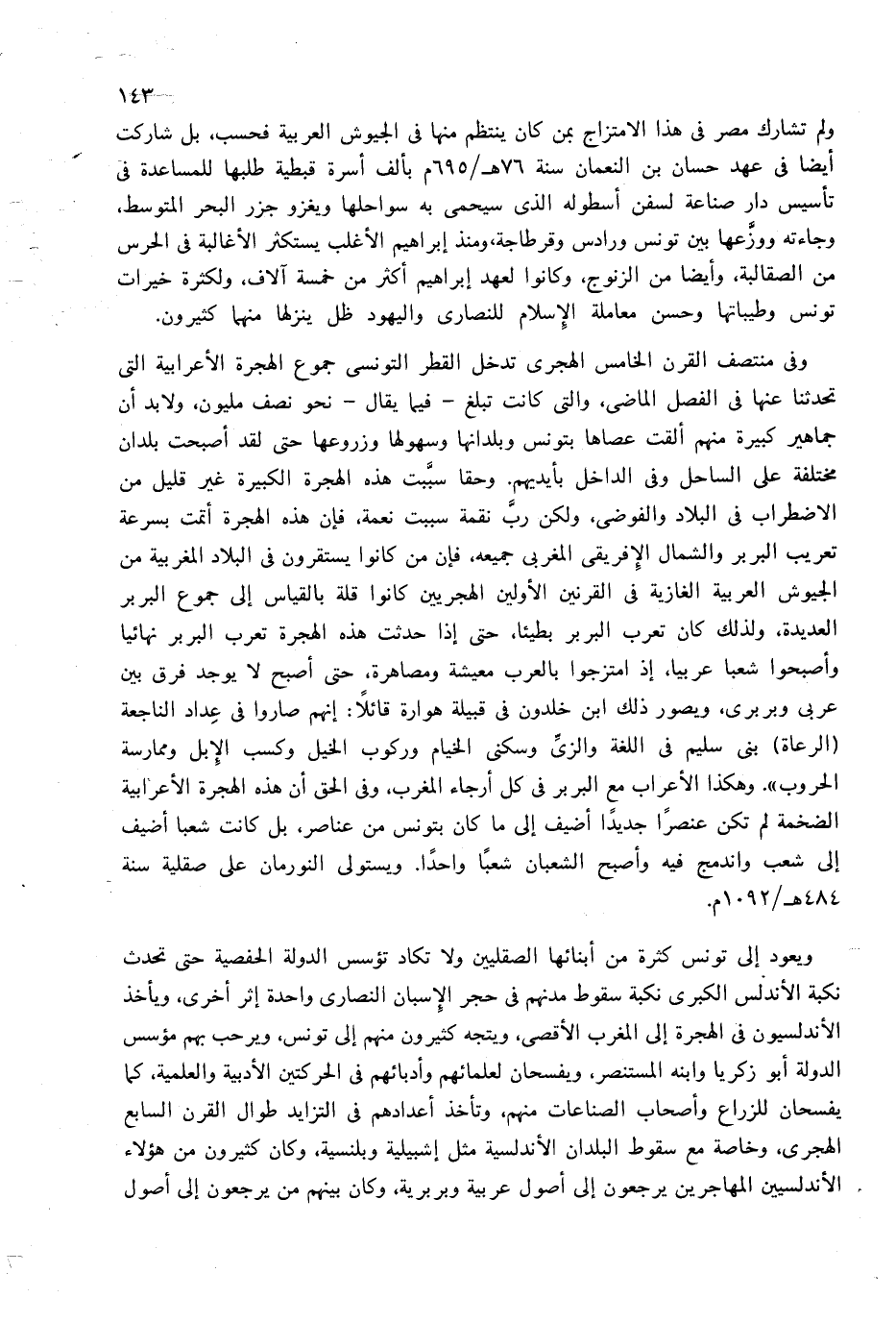 وفى منتصف القرن الخامس الهجرى تدخل القطر التونسى جموع الهجرة الأعرابية التى تحدثنا عنها فى الفصل الماضى، والتى كانت تبلغ-فيما يقال-نحو نصف مليون، ولا بد أن جماهير كبيرة منهم ألقت عصاها بتونس وبلدانها وسهولها وزروعها حتى لقد أصبحت بلدان مختلفة على الساحل وفى الداخل بأيديهم. وحقا سبّبت هذه الهجرة الكبيرة غير قليل من الاضطراب فى البلاد والفوضى، ولكن ربّ نقمة سببت نعمة، فإن هذه الهجرة أتمت بسرعة تعريب البربر والشمال الإفريقى المغربى جميعه، فإن من كانوا يستقرون فى البلاد المغربية من الجيوش العربية الغازية فى القرنين الأولين الهجريين كانوا قلة بالقياس إلى جموع البربر العديدة، ولذلك كان تعرب البربر بطيئا، حتى إذا حدثت هذه الهجرة تعرب البربر نهائيا وأصبحوا شعبا عربيا، إذ امتزجوا بالعرب معيشة ومصاهرة، حتى أصبح لا يوجد فرق بين عربى وبربرى، ويصور ذلك ابن خلدون فى قبيلة هوارة قائلا: إنهم صاروا فى عداد الناجعة (الرعاة) بنى سليم فى اللغة والزىّ وسكنى الخيام وركوب الخيل وكسب الإبل وممارسة الحروب». وهكذا الأعراب مع البربر فى كل أرجاء المغرب، وفى الحق أن هذه الهجرة الأعرابية الضخمة لم تكن عنصرا جديدا أضيف إلى ما كان بتونس من عناصر، بل كانت شعبا أضيف إلى شعب واندمج فيه وأصبح الشعبان شعبا واحدا. ويستولى النورمان على صقلية سنة 484 هـ/1092 م.