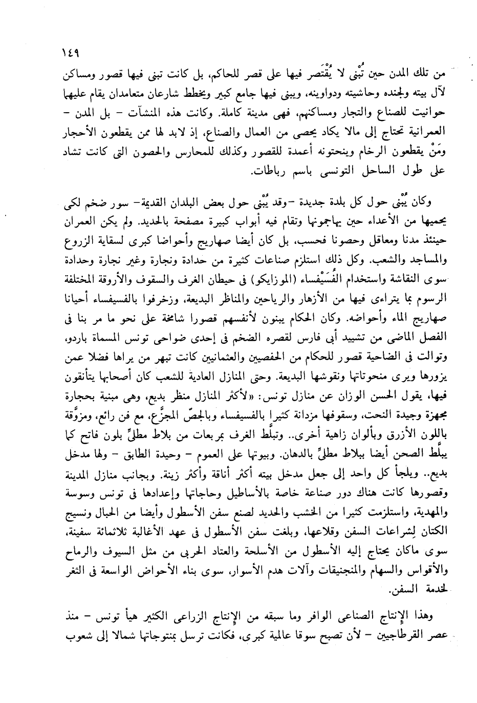 وكان يبنى حول كل بلدة جديدة-وقد يبنى حول بعض البلدان القديمة-سور ضخم لكى يحميها من الأعداء حين يهاجمونها وتقام فيه أبواب كبيرة مصفحة بالحديد. ولم يكن العمران حينئذ مدنا ومعاقل وحصونا فحسب، بل كان أيضا صهاريج وأحواضا كبرى لسقاية الزروع والمساجد والشعب. وكل ذلك استلزم صناعات كثيرة من حدادة ونجارة وغير نجارة وحدادة سوى النقاشة واستخدام الفسيفساء (الموزايكو) فى حيطان الغرف والسقوف والأروقة المختلفة الرسوم بما يتراءى فيها من الأزهار والرياحين والمناظر البديعة، وزخرفوا بالفسيفساء أحيانا صهاريج الماء وأحواضه. وكان الحكام يبنون لأنفسهم قصورا شامخة على نحو ما مر بنا فى الفصل الماضى من تشييد أبى فارس لقصره الضخم فى إحدى ضواحى تونس المسماة باردو، وتوالت فى الضاحية قصور للحكام من الحفصيين والعثمانيين كانت تبهر من يراها فضلا عمن يزورها ويرى منحوتاتها ونقوشها البديعة. وحتى المنازل العادية للشعب كان أصحابها يتأنقون فيها، يقول الحسن الوزان عن منازل تونس: «لأكثر المنازل منظر بديع، وهى مبنية بحجارة مجهزة وجيدة النحت، وسقوفها مزدانة كثيرا بالفسيفساء وبالجصّ المجزّع، مع فن رائع، ومزوّقة باللون الأزرق وبألوان زاهية أخرى. . وتبلّط الغرف بمربعات من بلاط مطلىّ بلون فاتح كما يبلّط الصحن أيضا ببلاط مطلىّ بالدهان. وبيوتها على العموم-وحيدة الطابق-ولها مدخل بديع. . ويلجأ كل واحد إلى جعل مدخل بيته أكثر أناقة وأكثر زينة. وبجانب منازل المدينة وقصورها كانت هناك دور صناعة خاصة بالأساطيل وحاجاتها وإعدادها فى تونس وسوسة والمهدية، واستلزمت كثيرا من الخشب والحديد لصنع سفن الأسطول وأيضا من الحبال ونسيج الكتان لشراعات السفن وقلاعها، وبلغت سفن الأسطول فى عهد الأغالبة ثلاثمائة سفينة، سوى ما كان يحتاج إليه الأسطول من الأسلحة والعتاد الحربى من مثل السيوف والرماح والأقواس والسهام والمنجنيقات وآلات هدم الأسوار، سوى بناء الأحواض الواسعة فى الثغر لخدمة السفن.