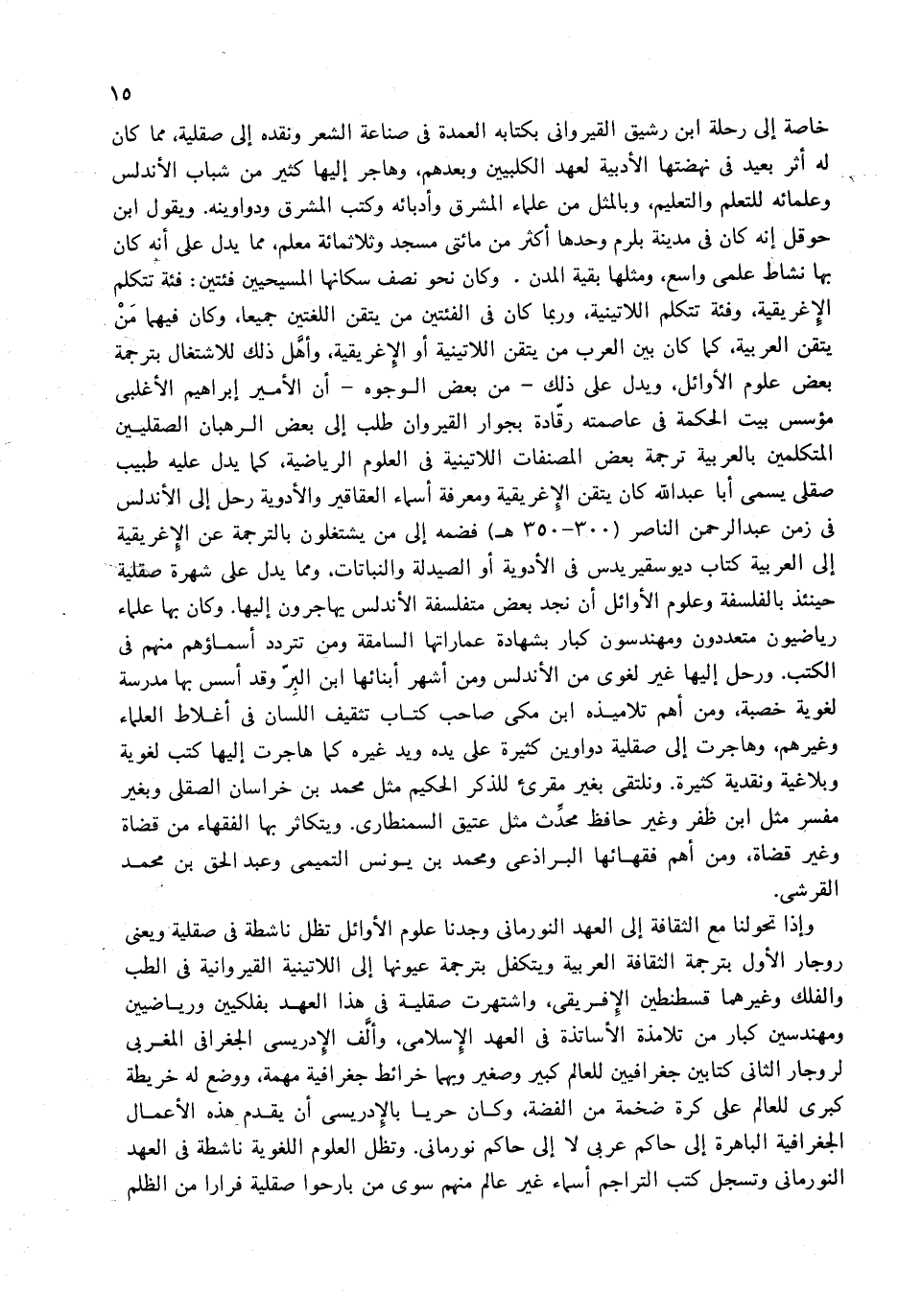 خاصة إلى رحلة ابن رشيق القيروانى بكتابه العمدة فى صناعة الشعر ونقده إلى صقلية، مما كان له أثر بعيد فى نهضتها الأدبية لعهد الكلبيين وبعدهم، وهاجر إليها كثير من شباب الأندلس وعلمائه للتعلم والتعليم، وبالمثل من علماء المشرق وأدبائه وكتب المشرق ودواوينه. ويقول ابن حوقل إنه كان فى مدينة بلرم وحدها أكثر من مائتى مسجد وثلاثمائة معلم، مما يدل على أنه كان بها نشاط علمى واسع، ومثلها بقية المدن. وكان نحو نصف سكانها المسيحيين فئتين: فئة تتكلم الإغريقية، وفئة تتكلم اللاتينية، وربما كان فى الفئتين من يتقن اللغتين جميعا، وكان فيهما من يتقن العربية، كما كان بين العرب من يتقن اللاتينية أو الإغريقية، وأهّل ذلك للاشتغال بترجمة بعض علوم الأوائل، ويدل على ذلك-من بعض الوجوه-أن الأمير إبراهيم الأغلبى مؤسس بيت الحكمة فى عاصمته رقّادة بجوار القيروان طلب إلى بعض الرهبان الصقليين المتكلمين بالعربية ترجمة بعض المصنفات اللاتينية فى العلوم الرياضية، كما يدل عليه طبيب صقلى يسمى أبا عبد الله كان يتقن الإغريقية ومعرفة أسماء العقاقير والأدوية رحل إلى الأندلس فى زمن عبد الرحمن الناصر (300 - 350 هـ) فضمه إلى من يشتغلون بالترجمة عن الإغريقية إلى العربية كتاب ديوسقيريدس فى الأدوية أو الصيدلة والنباتات، ومما يدل على شهرة صقلية حينئذ بالفلسفة وعلوم الأوائل أن نجد بعض متفلسفة الأندلس يهاجرون إليها. وكان بها علماء رياضيون متعددون ومهندسون كبار بشهادة عماراتها السامقة ومن تتردد أسماؤهم منهم فى الكتب. ورحل إليها غير لغوى من الأندلس ومن أشهر أبنائها ابن البرّ وقد أسس بها مدرسة لغوية خصبة، ومن أهم تلاميذه ابن مكى صاحب كتاب تثقيف اللسان فى أغلاط العلماء وغيرهم، وهاجرت إلى صقلية دواوين كثيرة على يده ويد غيره كما هاجرت إليها كتب لغوية وبلاغية ونقدية كثيرة. ونلتقى بغير مقرئ للذكر الحكيم مثل محمد بن خراسان الصقلى وبغير مفسر مثل ابن ظفر وغير حافظ محدّث مثل عتيق السمنطارى. ويتكاثر بها الفقهاء من قضاة وغير قضاة، ومن أهم فقهائها البراذعي ومحمد بن يونس التميمى وعبد الحق بن محمد القرشى.