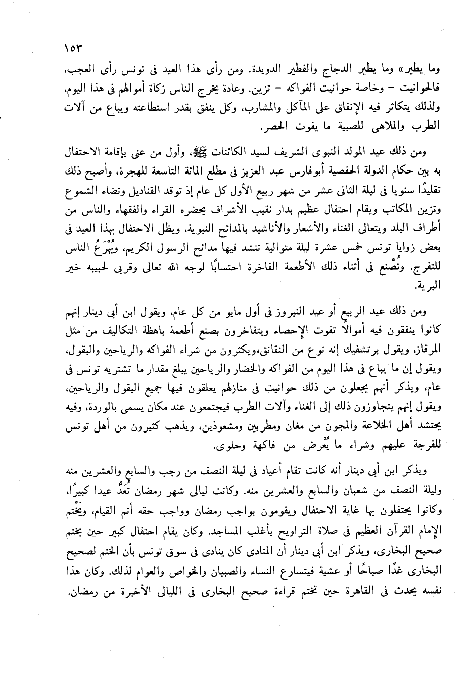 وما يطير» وما يطير الدجاج والفطير الدويدة. ومن رأى هذا العيد فى تونس رأى العجب، فالحوانيت-وخاصة حوانيت الفواكه-تزين. وعادة يخرج الناس زكاة أموالهم فى هذا اليوم، ولذلك يتكاثر فيه الإنفاق على المآكل والمشارب، وكل ينفق بقدر استطاعته ويباع من آلات الطرب والملاهى للصبية ما يفوت الحصر.
