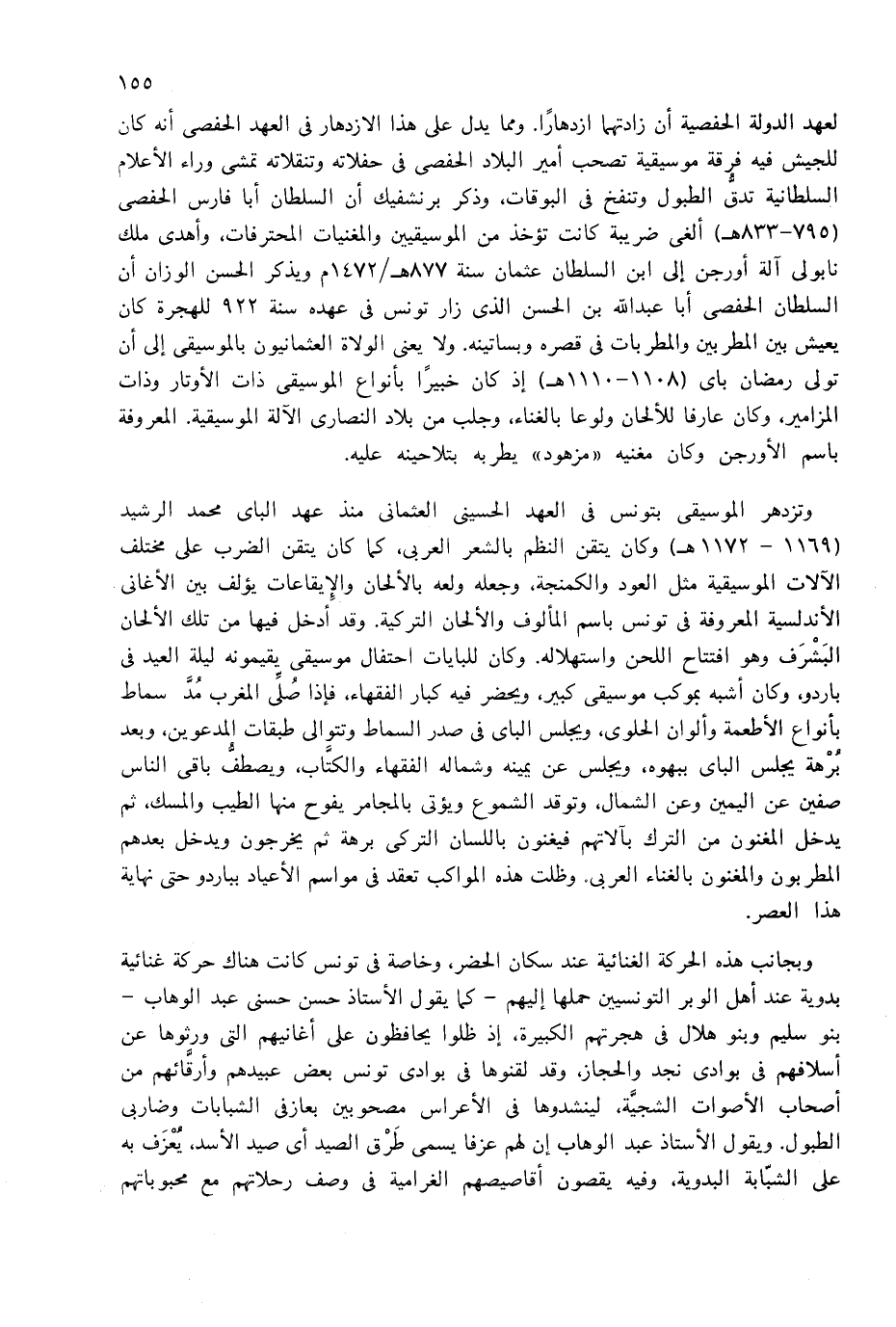 لعهد الدولة الحفصية أن زادتهما ازدهارا. ومما يدل على هذا الازدهار فى العهد الحفصى أنه كان للجيش فيه فرقة موسيقية تصحب أمير البلاد الحفصى فى حفلاته وتنقلاته تمشى وراء الأعلام السلطانية تدقّ الطبول وتنفخ فى البوقات، وذكر برنشفيك أن السلطان أبا فارس الحفصى (795 - 833 هـ) ألغى ضريبة كانت تؤخذ من الموسيقيين والمغنيات المحترفات، وأهدى ملك نابولى آلة أورجن إلى ابن السلطان عثمان سنة 877 هـ/1472 م ويذكر الحسن الوزان أن السلطان الحفصى أبا عبد الله بن الحسن الذى زار تونس فى عهده سنة 922 للهجرة كان يعيش بين المطربين والمطربات فى قصره وبساتينه. ولا يعنى الولاة العثمانيون بالموسيقى إلى أن تولى رمضان باى (1108 - 1110 هـ) إذ كان خبيرا بأنواع الموسيقى ذات الأوتار وذات المزامير، وكان عارفا للألحان ولوعا بالغناء، وجلب من بلاد النصارى الآلة الموسيقية. المعروفة باسم الأورجن وكان مغنيه «مزهود» يطربه بتلاحينه عليه.