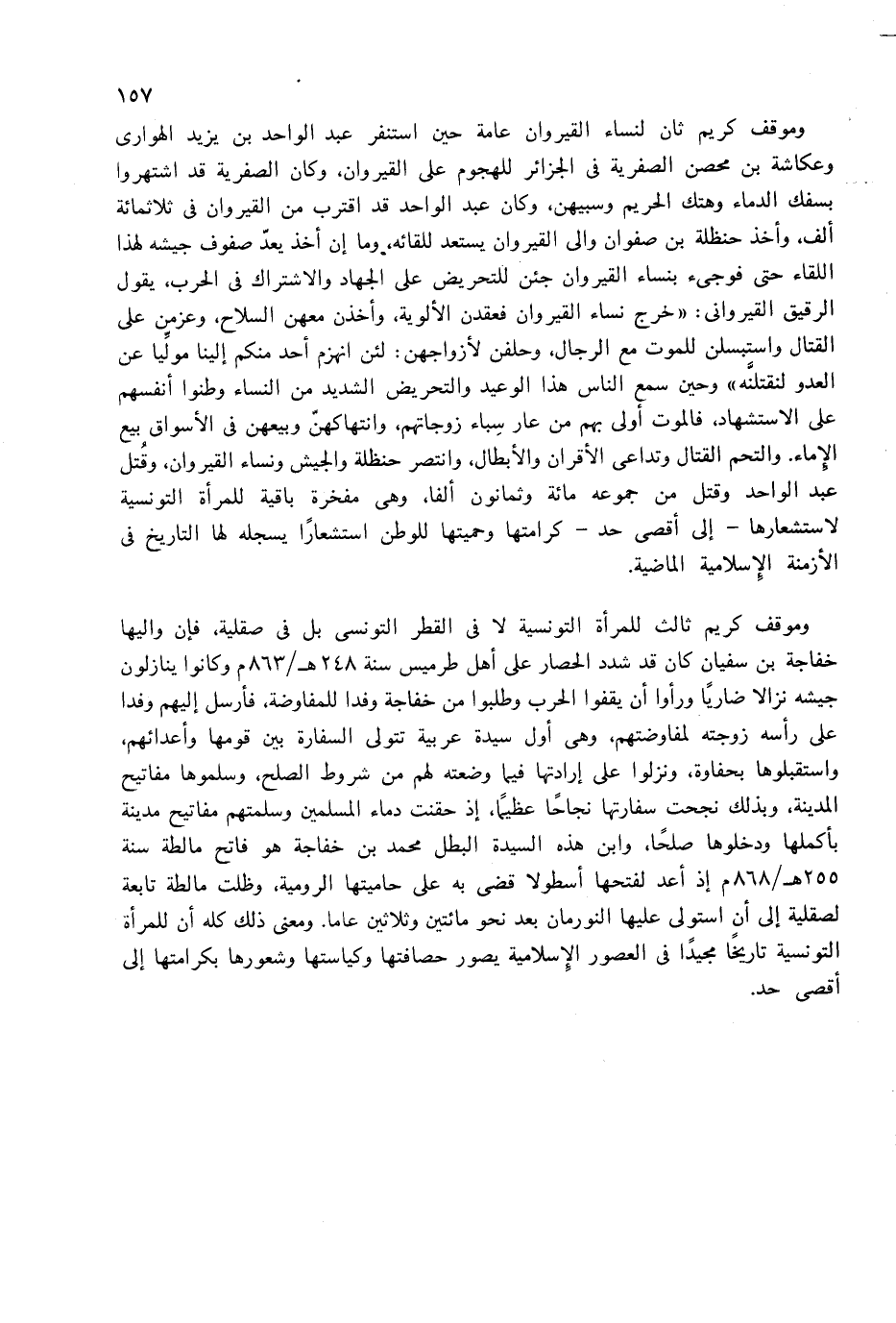 وموقف كريم ثان لنساء القيروان عامة حين استنفر عبد الواحد بن يزيد الهوارى وعكاشة بن محصن الصفرية فى الجزائر للهجوم على القيروان، وكان الصفرية قد اشتهروا بسفك الدماء وهتك الحريم وسبيهن، وكان عبد الواحد قد اقترب من القيروان فى ثلاثمائة ألف، وأخذ حنظلة بن صفوان والى القيروان يستعد للقائه، وما إن أخذ يعدّ صفوف جيشه لهذا اللقاء حتى فوجئ بنساء القيروان جئن للتحريض على الجهاد والاشتراك فى الحرب، يقول الرقيق القيروانى: «خرج نساء القيروان فعقدن الألوية، وأخذن معهن السلاح، وعزمن على القتال واستبسلن للموت مع الرجال، وحلفن لأزواجهن: لئن انهزم أحد منكم إلينا مولّيا عن العدو لنقتلنّه» وحين سمع الناس هذا الوعيد والتحريض الشديد من النساء وطنوا أنفسهم على الاستشهاد، فالموت أولى بهم من عار سباء زوجاتهم، وانتهاكهنّ وبيعهن فى الأسواق بيع الإماء. والتحم القتال وتداعى الأقران والأبطال، وانتصر حنظلة والجيش ونساء القيروان، وقتل عبد الواحد وقتل من جموعه مائة وثمانون ألفا، وهى مفخرة باقية للمرأة التونسية لاستشعارها-إلى أقصى حد-كرامتها وحميتها للوطن استشعارا يسجله لها التاريخ فى الأزمنة الإسلامية الماضية.