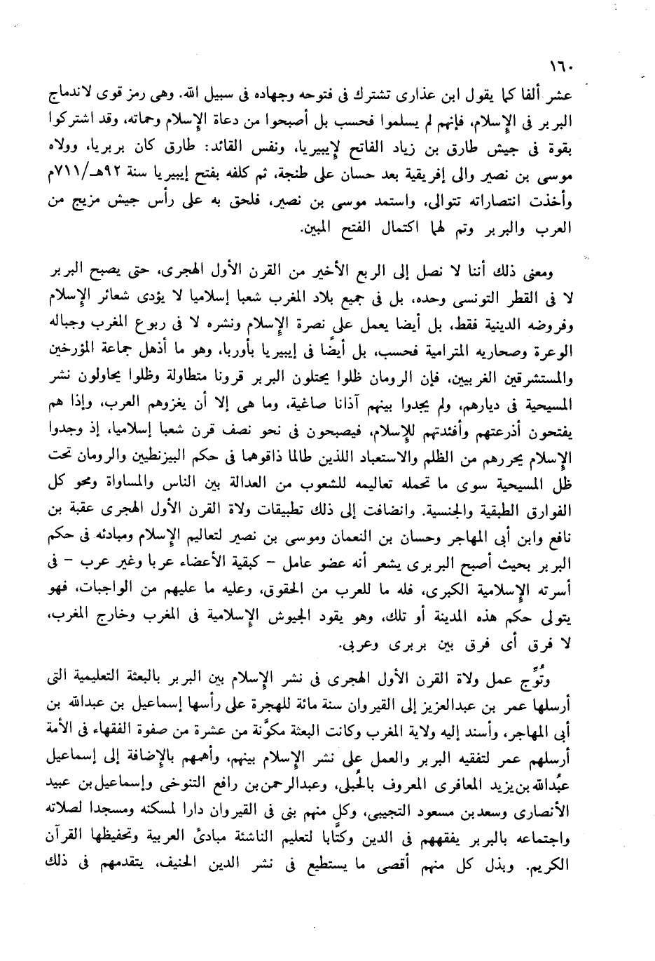 ومعنى ذلك أننا لا نصل إلى الربع الأخير من القرن الأول الهجرى، حتى يصبح البربر لا فى القطر التونسى وحده، بل فى جميع بلاد المغرب شعبا إسلاميا لا يؤدى شعائر الإسلام وفروضه الدينية فقط، بل أيضا يعمل على نصرة الإسلام ونشره لا فى ربوع المغرب وجباله الوعرة وصحاريه المترامية فحسب، بل أيضا فى إيبيريا بأوربا، وهو ما أذهل جماعة المؤرخين والمستشرقين الغربيين، فإن الرومان ظلوا يحتلون البربر قرونا متطاولة وظلوا يحاولون نشر المسيحية فى ديارهم، ولم يجدوا بينهم آذانا صاغية، وما هى إلا أن يغزوهم العرب، وإذا هم يفتحون أذرعتهم وأفئدتهم للإسلام، فيصبحون فى نحو نصف قرن شعبا إسلاميا، إذ وجدوا الإسلام يحررهم من الظلم والاستعباد اللذين طالما ذاقوهما فى حكم البيزنطيين والرومان تحت ظل المسيحية سوى ما تحمله تعاليمه للشعوب من العدالة بين الناس والمساواة ومحو كل الفوارق الطبقية والجنسية. وانضافت إلى ذلك تطبيقات ولاة القرن الأول الهجرى عقبة بن نافع وابن أبى المهاجر وحسان بن النعمان وموسى بن نصير لتعاليم الإسلام ومبادئه فى حكم البربر بحيث أصبح البربرى يشعر أنه عضو عامل-كبقية الأعضاء عربا وغير عرب-فى أسرته الإسلامية الكبرى، فله ما للعرب من الحقوق، وعليه ما عليهم من الواجبات، فهو يتولى حكم هذه المدينة أو تلك، وهو يقود الجيوش الإسلامية فى المغرب وخارج المغرب، لا فرق أى فرق بين بربرى وعربى.