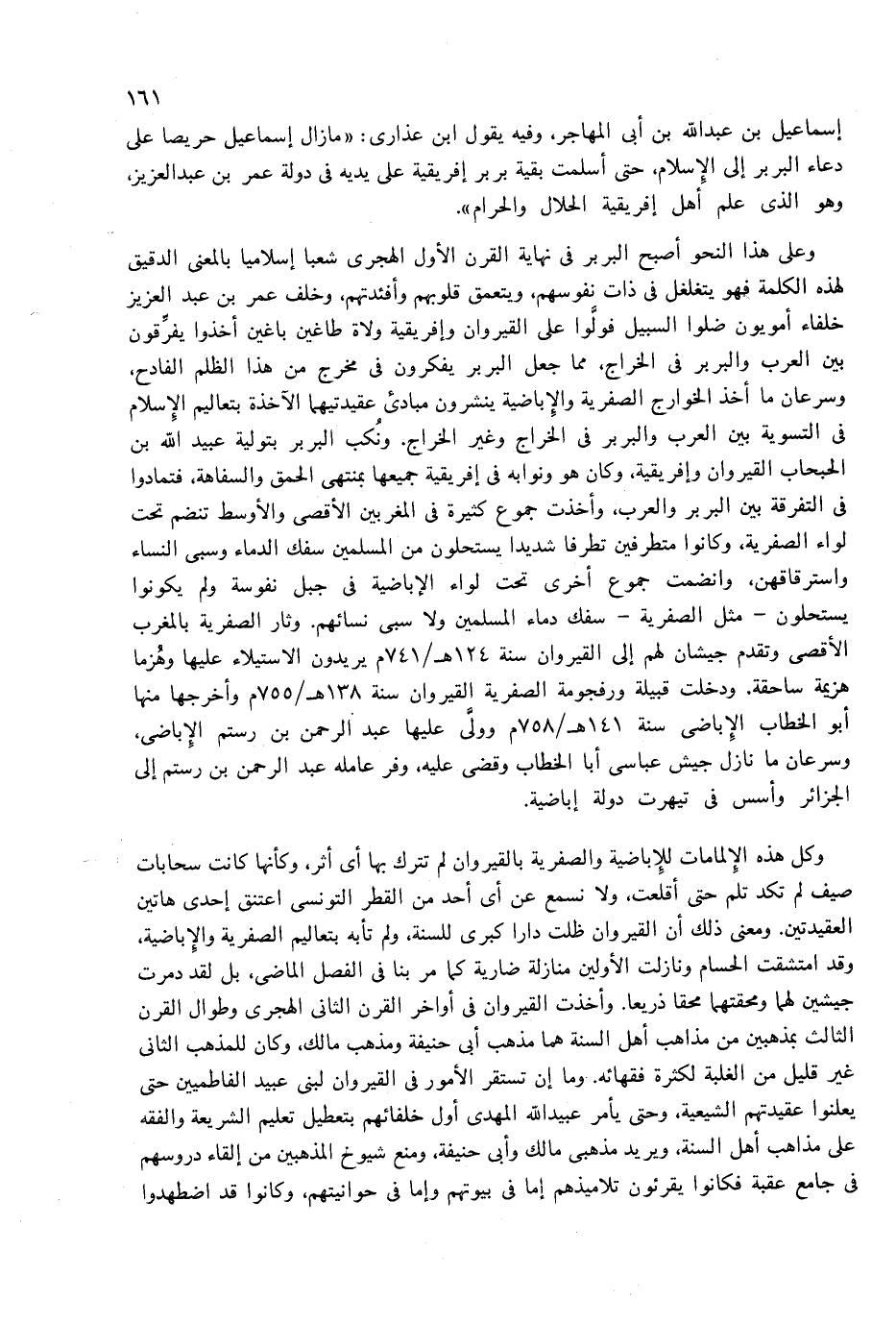 وعلى هذا النحو أصبح البربر فى نهاية القرن الأول الهجرى شعبا إسلاميا بالمعنى الدقيق لهذه الكلمة فهو يتغلغل فى ذات نفوسهم، ويتعمق قلوبهم وأفئدتهم، وخلف عمر بن عبد العزيز خلفاء أمويون ضلوا السبيل فولّوا على القيروان وإفريقية ولاة طاغين باغين أخذوا يفرّقون بين العرب والبربر فى الخراج، مما جعل البربر يفكرون فى مخرج من هذا الظلم الفادح، وسرعان ما أخذ الخوارج الصفرية والإباضية ينشرون مبادئ عقيدتيهما الآخذة بتعاليم الإسلام فى التسوية بين العرب والبربر فى الخراج وغير الخراج. ونكب البربر بتولية عبيد الله بن الحبحاب القيروان وإفريقية، وكان هو ونوابه فى إفريقية جميعها بمنتهى الحمق والسفاهة، فتمادوا فى التفرقة بين البربر والعرب، وأخذت جموع كثيرة فى المغربين الأقصى والأوسط تنضم تحت لواء الصفرية، وكانوا متطرفين تطرفا شديدا يستحلون من المسلمين سفك الدماء وسبى النساء واسترقاقهن، وانضمت جموع أخرى تحت لواء الإباضية فى جبل نفوسة ولم يكونوا يستحلون-مثل الصفرية-سفك دماء المسلمين ولا سبى نسائهم. وثار الصفرية بالمغرب الأقصى وتقدم جيشان لهم إلى القيروان سنة 124 هـ/741 م يريدون الاستيلاء عليها وهزما هزيمة ساحقة. ودخلت قبيلة ورفجومة الصفرية القيروان سنة 138 هـ/755 م وأخرجها منها أبو الخطاب الإباضى سنة 141 هـ/758 م وولّى عليها عبد الرحمن بن رستم الإباضى، وسرعان ما نازل جيش عباسى أبا الخطاب وقضى عليه، وفر عامله عبد الرحمن بن رستم إلى الجزائر وأسس فى تيهرت دولة إباضية.