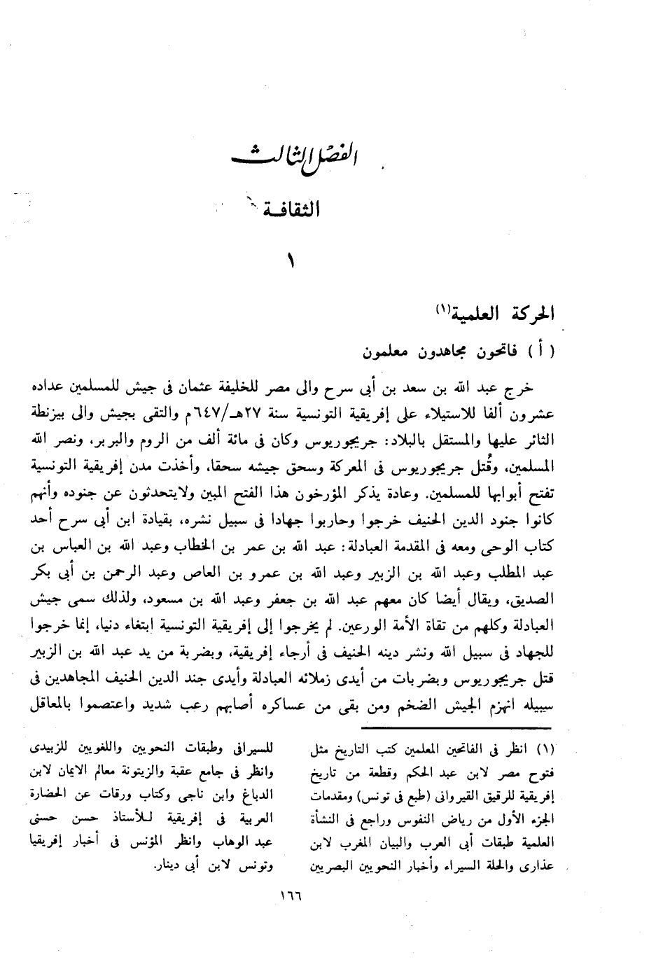 (¬1) انظر فى الفاتحين المعلمين كتب التاريخ مثل فتوح مصر لابن عبد الحكم وقطعة من تاريخ إفريقية للرقيق القيروانى (طبع فى تونس) ومقدمات الجزء الأول من رياض النفوس وراجع فى النشأة العلمية طبقات أبى العرب والبيان المغرب لابن عذارى والحلة السيراء وأخبار النحويين البصريين للسيرافى وطبقات النحويين واللغويين للزبيدى وانظر فى جامع عقبة والزيتونة معالم الايمان لابن الدباغ وابن ناجى وكتاب ورقات عن الحضارة العربية فى إفريقية للأستاذ حسن حسنى عبد الوهاب وانظر المؤنس فى أخبار إفريقيا وتونس لابن أبى دينار.