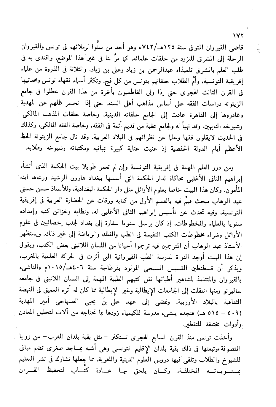 قاضى القيروان المتوفى سنة 125 هـ/742 م وهو أحد من سنّوا لزملائهم فى تونس والقيروان الرحلة إلى المشرق للتزود من حلقات علمائه، كما مرّ بنا فى غير هذا الموضع، واقتدى به فى طلب العلم بالمشرق تلميذاه عبد الرحمن بن زياد وعلى بن زياد، والثلاثة فى الذروة من علماء إفريقية التونسية، وأمّ الطلاب حلقاتهم بتونس من كل فج. وتكثر أسماء فقهاء تونس ومحدثيها فى القرن الثالث الهجرى حتى إذا ولى الفاطميون بأخرة من هذا القرن عطلوا فى جامع الزيتونة دراسات الفقه على أساس مذاهب أهل السنة، حتى إذا انحسر ظلهم عن المهدية وغادروها إلى القاهرة عادت إلى الجامع حلقاته الدينية، وخاصة حلقات المذهب المالكى وشيوخه النابهين، وقد تهيأ له ولجامع عقبة من قديم أئمة فى الفقه، وخاصة الفقه المالكى، وكذلك فى الحديث لا يقلون فقها وعلما عن نظرائهم فى البلاد العربية. وقد نال جامع الزيتونة الحظ الأعظم أيام الدولة الحفصية إذ عنيت عناية كبيرة بمبانيه ومكتباته وشيوخه وطلابه.