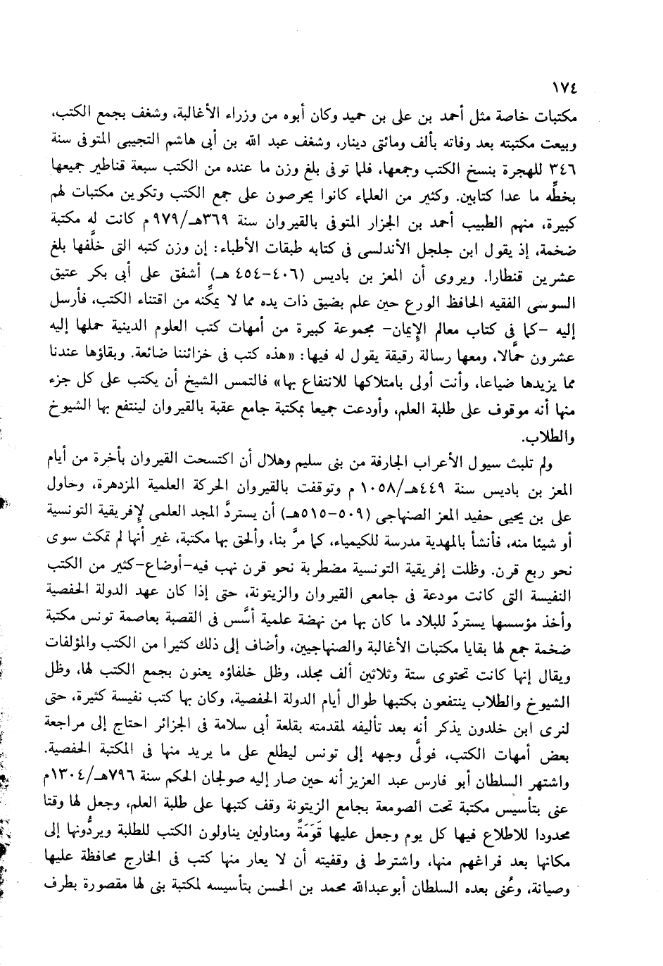 ولم تلبث سيول الأعراب الجارفة من بنى سليم وهلال أن اكتسحت القيروان بأخرة من أيام المعز بن باديس سنة 449 هـ/1058 م وتوقفت بالقيروان الحركة العلمية المزدهرة، وحاول على بن يحيى حفيد المعز الصنهاجى (509 - 515 هـ) أن يستردّ المجد العلمى لإفريقية التونسية أو شيئا منه، فأنشأ بالمهدية مدرسة للكيمياء، كما مرّ بنا، وألحق بها مكتبة، غير أنها لم تمكث سوى نحو ربع قرن. وظلت إفريقية التونسية مضطربة نحو قرن نهب فيه-أوضاع-كثير من الكتب النفيسة التى كانت مودعة فى جامعى القيروان والزيتونة، حتى إذا كان عهد الدولة الحفصية وأخذ مؤسسها يستردّ للبلاد ما كان بها من نهضة علمية أسّس فى القصبة بعاصمة تونس مكتبة ضخمة جمع لها بقايا مكتبات الأغالبة والصنهاجيين، وأضاف إلى ذلك كثيرا من الكتب والمؤلفات ويقال إنها كانت تحتوى ستة وثلاثين ألف مجلد، وظل خلفاؤه يعنون بجمع الكتب لها، وظل الشيوخ والطلاب ينتفعون بكتبها طوال أيام الدولة الحفصية، وكان بها كتب نفيسة كثيرة، حتى لنرى ابن خلدون يذكر أنه بعد تأليفه لمقدمته بقلعة أبى سلامة فى الجزائر احتاج إلى مراجعة بعض أمهات الكتب، فولّى وجهه إلى تونس ليطلع على ما يريد منها فى المكتبة الحفصية.