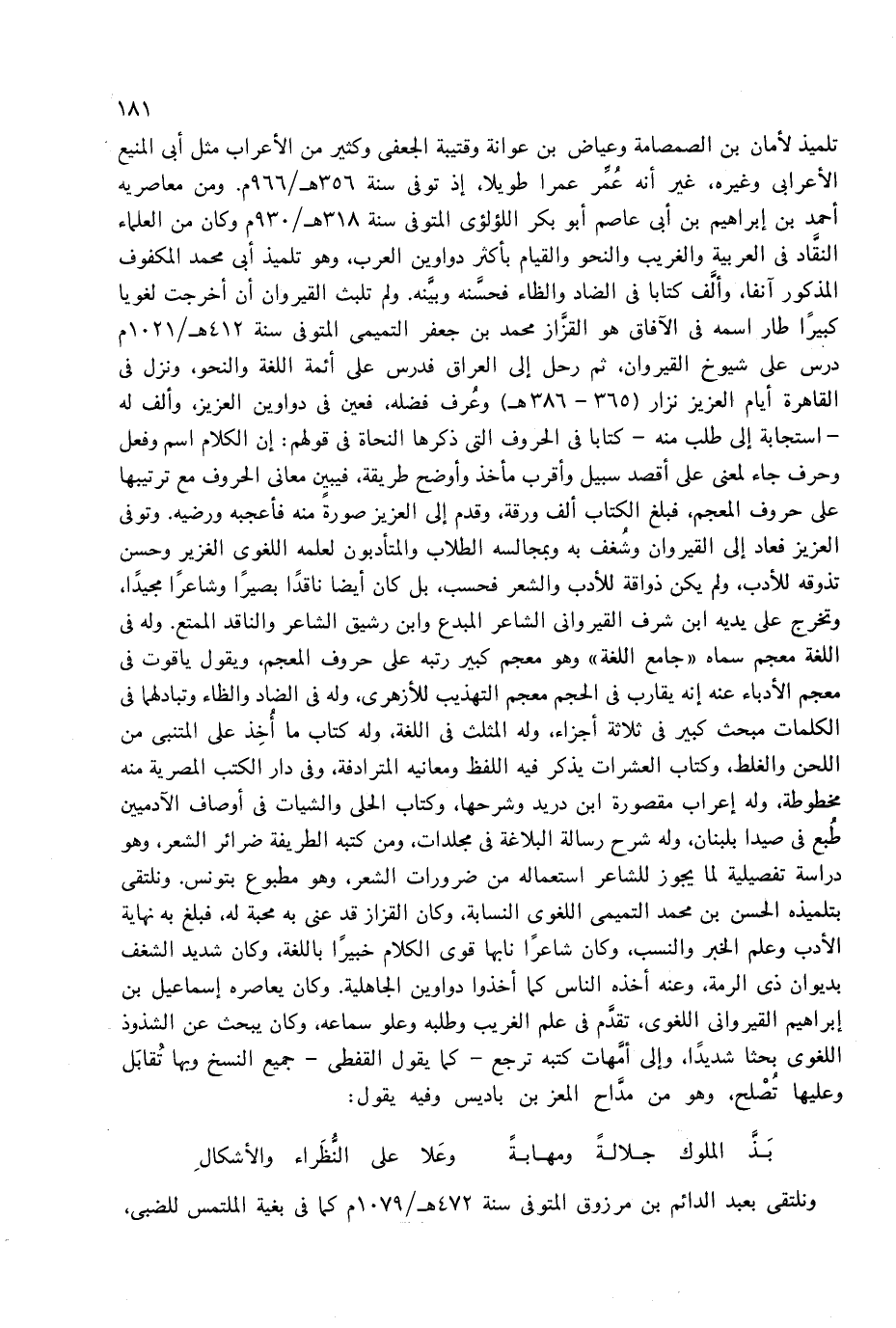 تلميذ لأمان بن الصمصامة وعياض بن عوانة وقتيبة الجعفى وكثير من الأعراب مثل أبى المنيع الأعرابى وغيره، غير أنه عمّر عمرا طويلا، إذ توفى سنة 356 هـ/966 م. ومن معاصريه أحمد بن إبراهيم بن أبى عاصم أبو بكر اللؤلؤى المتوفى سنة 318 هـ/930 م وكان من العلماء النقّاد فى العربية والغريب والنحو والقيام بأكثر دواوين العرب، وهو تلميذ أبى محمد المكفوف المذكور آنفا، وألّف كتابا فى الضاد والظاء فحسّنه وبيّنه. ولم تلبث القيروان أن أخرجت لغويا كبيرا طار اسمه فى الآفاق هو القزّاز محمد بن جعفر التميمى المتوفى سنة 412 هـ/1021 م درس على شيوخ القيروان، ثم رحل إلى العراق فدرس على أئمة اللغة والنحو، ونزل فى القاهرة أيام العزيز نزار (365 - 386 هـ) وعرف فضله، فعين فى دواوين العزيز، وألف له -استجابة إلى طلب منه-كتابا فى الحروف التى ذكرها النحاة فى قولهم: إن الكلام اسم وفعل وحرف جاء لمعنى على أقصد سبيل وأقرب مأخذ وأوضح طريقة، فيبين معانى الحروف مع ترتيبها على حروف المعجم، فبلغ الكتاب ألف ورقة، وقدم إلى العزيز صورة منه فأعجبه ورضيه. وتوفى العزيز فعاد إلى القيروان وشغف به وبمجالسه الطلاب والمتأدبون لعلمه اللغوى الغزير وحسن تذوقه للأدب، ولم يكن ذواقة للأدب والشعر فحسب، بل كان أيضا ناقدا بصيرا وشاعرا مجيدا، وتخرج على يديه ابن شرف القيروانى الشاعر المبدع وابن رشيق الشاعر والناقد الممتع. وله فى اللغة معجم سماه «جامع اللغة» وهو معجم كبير رتبه على حروف المعجم، ويقول ياقوت فى معجم الأدباء عنه إنه يقارب فى الحجم معجم التهذيب للأزهرى، وله فى الضاد والظاء وتبادلهما فى الكلمات مبحث كبير فى ثلاثة أجزاء، وله المثلث فى اللغة، وله كتاب ما أخذ على المتنبى من اللحن والغلط، وكتاب العشرات يذكر فيه اللفظ ومعانيه المترادفة، وفى دار الكتب المصرية منه مخطوطة، وله إعراب مقصورة ابن دريد وشرحها، وكتاب الحلى والشيات فى أوصاف الآدميين طبع فى صيدا بلبنان، وله شرح رسالة البلاغة فى مجلدات، ومن كتبه الطريفة ضرائر الشعر، وهو دراسة تفصيلية لما يجوز للشاعر استعماله من ضرورات الشعر، وهو مطبوع بتونس. ونلتقى بتلميذه الحسن بن محمد التميمى اللغوى النسابة، وكان القزاز قد عنى به محبة له، فبلغ به نهاية الأدب وعلم الخبر والنسب، وكان شاعرا نابها قوى الكلام خبيرا باللغة، وكان شديد الشغف بديوان ذى الرمة، وعنه أخذه الناس كما أخذوا دواوين الجاهلية. وكان يعاصره إسماعيل بن إبراهيم القيروانى اللغوى، تقدّم فى علم الغريب وطلبه وعلو سماعه، وكان يبحث عن الشذوذ اللغوى بحثا شديدا، وإلى أمّهات كتبه ترجع-كما يقول القفطى-جميع النسخ وبها تقابل وعليها تصلح، وهو من مدّاح المعز بن باديس وفيه يقول: