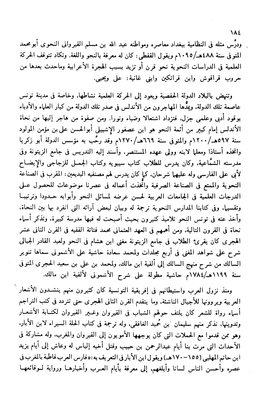وتنهض بالبلاد الدولة الحفصية ويعود إلى الحركة العلمية نشاطها، وخاصة فى مدينة تونس عاصمة تلك الدولة، ويمدّها المهاجرون من الأندلس فى صدر تلك الدولة من كبار العلماء والأدباء بوقود أدبى وعلمى جزل، فتزداد اشتعالا وضياء ونورا. ومن صفوة من هاجر إليها من نحاة الأندلس إمام كبير من أئمة النحو هو ابن عصفور الإشبيلى أبو الحسن على بن مؤمن المولود سنة 597 هـ/1200 م والمتوفى سنة 669 هـ/1270 م وقد رحّب به مؤسس الدولة أبو زكريا واتخذه أستاذا ومعلما لابنه وولى عهده المستنصر، وأسند إليه التدريس فى جامع الزيتونة وفى مدرسته الشمّاعية، وكان يدرس للطلاب كتاب سيبويه وكتاب الجمل للزجاجى والإيضاح لأبى على الفارسى وله عليهما شرحان، كما كان يدرس لهم مصنفيه البديعين: المقرب فى الصناعة النحوية والممتع فى الصناعة الصرفية واتّخذت أعماله فى عصرنا موضوعات للحصول على الدرجات العلمية فى الجامعات العربية لحسن عرضه لمسائل النحو وأبوابه حدودا وترتيبا وتقسيما، وفى كتابنا المدارس النحوية ترجمة له وبيان لبعض آرائه التى انفرد بها بين النحاة، وأخذ عنه فى تونس النحو تلاميذ كثيرون بحيث أصبحت له فيها مدرسة كبيرة، وتذكر أسماء نحاة فى القرون التالية، ومن أهمهم فى العهد العثمانى محمد فتاتة الفقيه فى القرن الثانى عشر الهجرى كان يقرئ الطلاب فى جامع الزيتونة مغنى ابن هشام فى النحو ولعبد القادر الجبالى شرح على شواهد المغنى فى أربع مجلدات ولمحمد سعادة حاشية على الأشمونى سماها تنوير السالك من شرح منهج السالك إلى ألفية ابن مالك، ولمحمد بن على بن سعيد الحجرى المتوفى سنة 1199 هـ/1784 م حاشية مطولة على شرح الأشمونى لألفية ابن مالك.