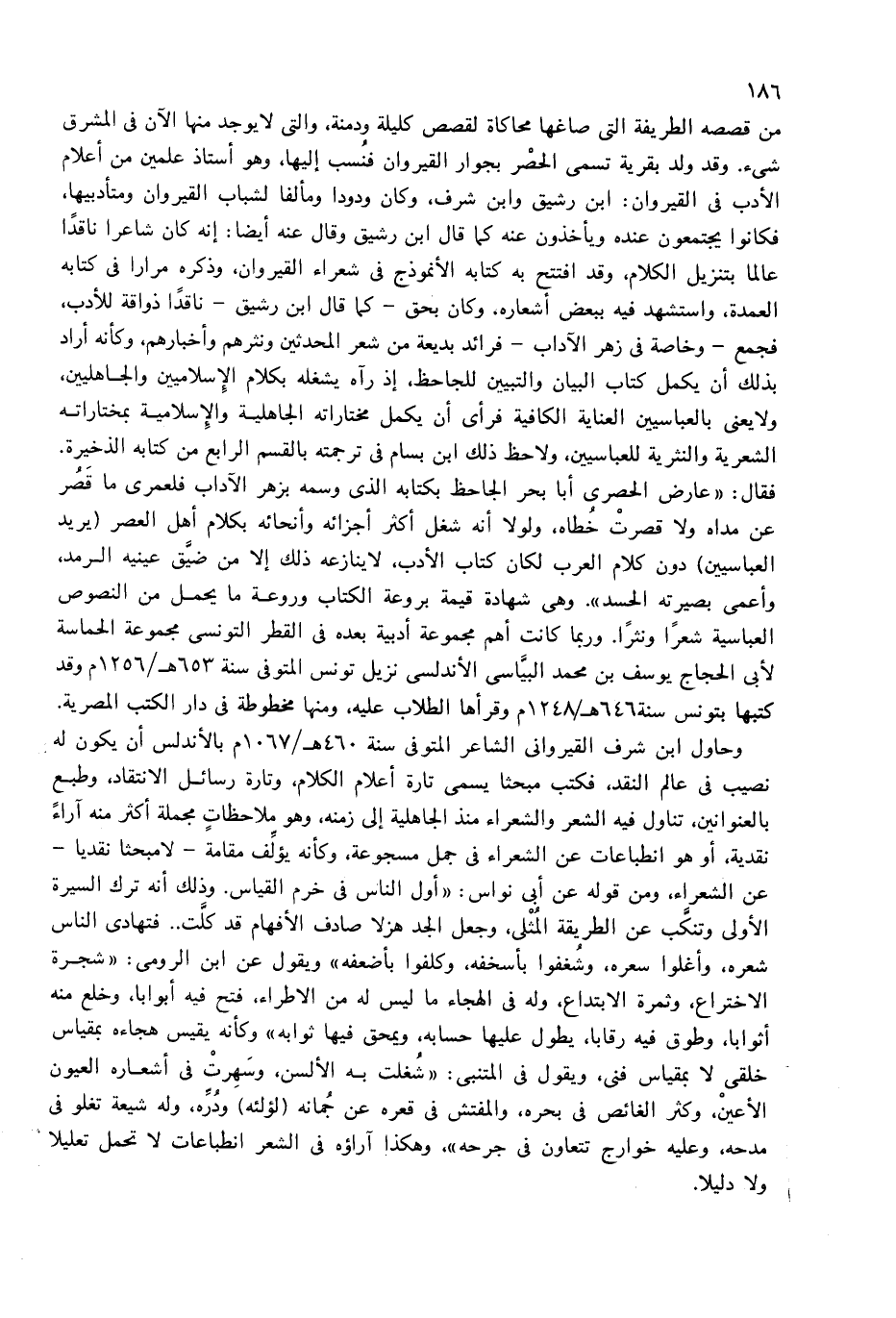 فقال: «عارض الحصرى أبا بحر الجاحظ بكتابه الذى وسمه بزهر الآداب فلعمرى ما قصر عن مداه ولا قصرت خطاه، ولولا أنه شغل أكثر أجزائه وأنحائه بكلام أهل العصر (يريد العباسيين) دون كلام العرب لكان كتاب الأدب، لا ينازعه ذلك إلا من ضيّق عينيه الرمد، وأعمى بصيرته الحسد». وهى شهادة قيمة بروعة الكتاب وروعة ما يحمل من النصوص العباسية شعرا ونثرا. وربما كانت أهم مجموعة أدبية بعده فى القطر التونسى مجموعة الحماسة لأبى الحجاج يوسف بن محمد البيّاسى الأندلسى نزيل تونس المتوفى سنة 653 هـ/1256 م وقد كتبها بتونس سنة 646 هـ/1248 م وقرأها الطلاب عليه، ومنها مخطوطة فى دار الكتب المصرية.