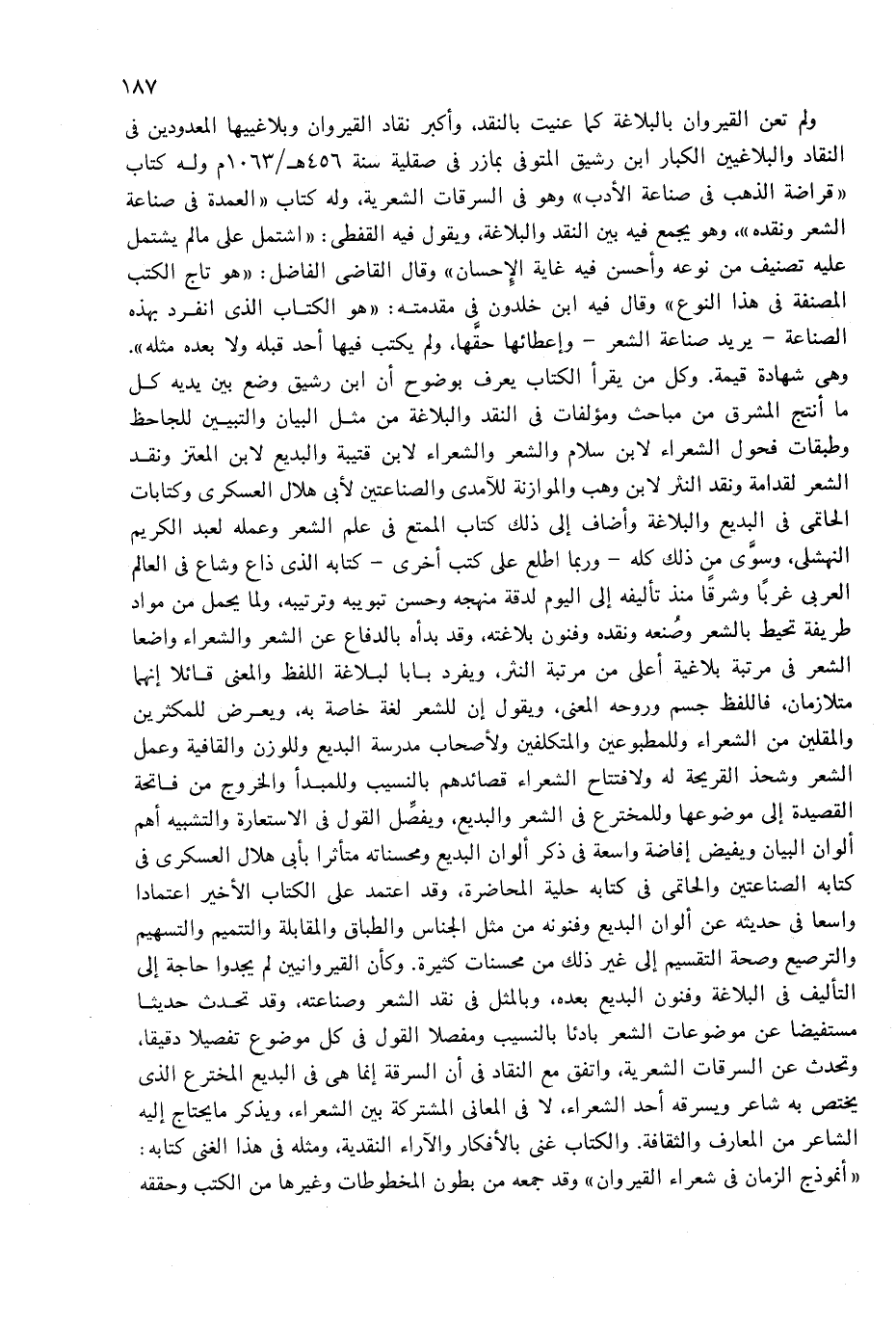 ولم تعن القيروان بالبلاغة كما عنيت بالنقد، وأكبر نقاد القيروان وبلاغييها المعدودين فى النقاد والبلاغيين الكبار ابن رشيق المتوفى بمازر فى صقلية سنة 456 هـ/1063 م وله كتاب «قراضة الذهب فى صناعة الأدب» وهو فى السرقات الشعرية، وله كتاب «العمدة فى صناعة الشعر ونقده»، وهو يجمع فيه بين النقد والبلاغة، ويقول فيه القفطى: «اشتمل على ما لم يشتمل عليه تصنيف من نوعه وأحسن فيه غاية الإحسان» وقال القاضى الفاضل: «هو تاج الكتب المصنفة فى هذا النوع» وقال فيه ابن خلدون فى مقدمته: «هو الكتاب الذى انفرد بهذه الصناعة-يريد صناعة الشعر-وإعطائها حقّها، ولم يكتب فيها أحد قبله ولا بعده مثله».