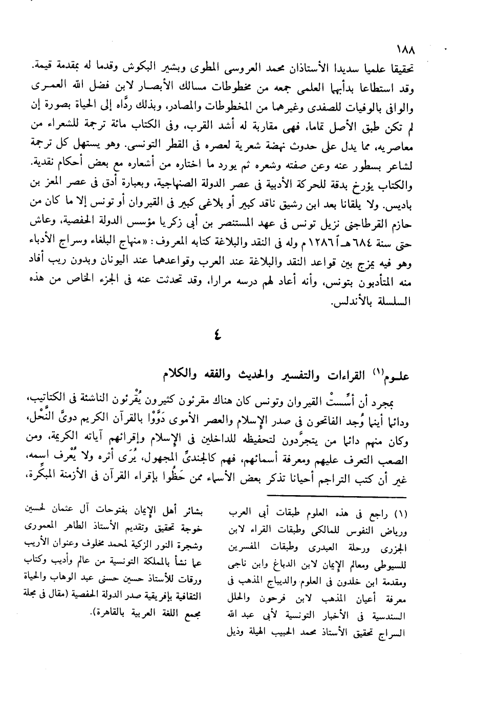 (¬1) راجع فى هذه العلوم طبقات أبى العرب ورياض النفوس للمالكى وطبقات القراء لابن الجزرى ورحلة العبدرى وطبقات المفسرين للسيوطى ومعالم الإيمان لابن الدباغ وابن ناجى ومقدمة ابن خلدون فى العلوم والديباج المذهب فى معرفة أعيان المذهب لابن فرحون والحلل السندسية فى الأخبار التونسية لأبى عبد الله السراج تحقيق الأستاذ محمد الحبيب الهيلة وذيل بشائر أهل الإيمان بفتوحات آل عثمان لحسين خوجة تحقيق وتقديم الأستاذ الطاهر المعمورى وشجرة النور الزكية لمحمد مخلوف وعنوان الأريب عما نشأ بالمملكة التونسية من عالم وأديب وكتاب ورقات للأستاذ حسين حسنى عبد الوهاب والحياة الثقافية بإفريقية صدر الدولة الحفصية (مقال فى مجلة مجمع اللغة العربية بالقاهرة).