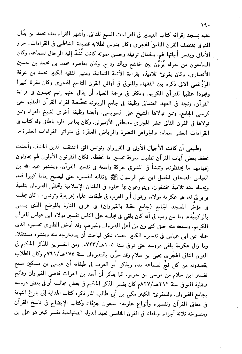 وطبيعى أن كانت الأجيال الأولى فى القيروان وتونس التى اعتنقت الدين الحنيف وأخذت تحفظ بعض آيات القرآن تطلبت معرفة تفسير ما تحفظه، فكان المقرءون الأولون لهم يحاولون إفهامهم ما يحفظونه، وتنشأ فى المشرق حركة واسعة فى تفسير القرآن، ويشتهر عبد الله بن العباس الصحابى الجليل ابن عم الرسول صلّى الله عليه وسلّم بإتقانه لتفسيره حتى ليصبح إماما كبيرا فيه، ويحمله عنه تلاميذ مختلفون، ويتوزعون بما حملوه فى البلدان الإسلامية وتحظى القيروان بتلميذ بربرىّ له، هو عكرمة مولاه، ويقول أبو العرب فى طبقات علماء إفريقية وتونس: «كان مجلسه فى مؤخّر المسجد الجامع (جامع عقبة بالقيروان) فى غربى المنارة بالموضع الذى يسمى بالركيبيّة». وما من ريب فى أنه كان يلقى فى مجلسه على الناس تفسير مولاه ابن عباس للقرآن الكريم، وسمعه منه خلق كثيرون من أهل القيروان وغيرهم، وقد أدخل الطبرى تفسيره الذى حمله عن ابن عباس فى تفسيره الكبير بحيث يمكن لباحث أن يستخرجه منه وينشره مستقلا، وما زال عكرمة يلقى دروسه حتى توفى سنة 105 هـ/723 م. ومن المفسرين للذكر الحكيم فى القرن الثانى الهجرى يحيى بن سلام وقد حرّره بالقيروان سنة 175 هـ/791 م وكان الطلاب يقصدونه من كل فجّ لسماعه منه، ويذكر أبو العرب فى طبقاته أن عيسى بن مسكين سمع تفسير ابن سلام من موسى بن جرير، كما يذكر أن أسد بن الفرات قاضى القيروان وفاتح صقلية المتوفى سنة 212 هـ/827 م كان يفسر الذكر الحكيم فى بعض مجالسه أو فى بعض دروسه بجامع القيروان، وللمقرئ الكبير مكى بن أبى طالب المار ذكره كتاب الهداية إلى بلوغ النهاية فى معانى القرآن وتفسيره وأنواع علومه: سبعون جزءا، وكتاب الإيضاح فى ناسخ القرآن ومنسوخة ثلاثة أجزاء. ويلقانا فى القرن الخامس لعهد الدولة الصنهاجية مفسر كبير هو على بن