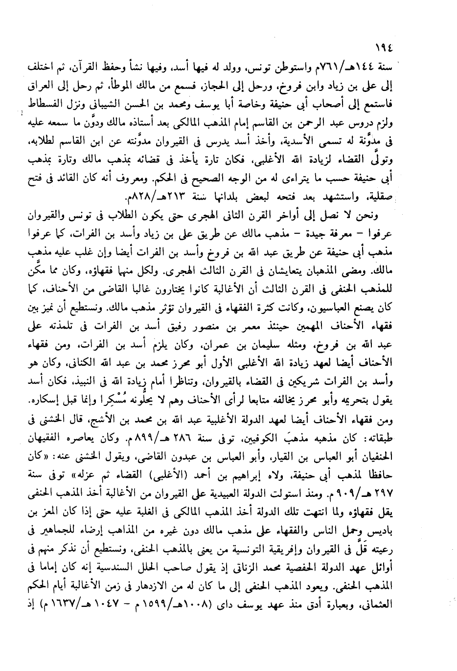 ونحن لا نصل إلى أواخر القرن الثانى الهجرى حتى يكون الطلاب فى تونس والقيروان عرفوا-معرفة جيدة-مذهب مالك عن طريق على بن زياد وأسد بن الفرات، كما عرفوا مذهب أبى حنيفة عن طريق عبد الله بن فروخ وأسد بن الفرات أيضا وإن غلب عليه مذهب مالك. ومضى المذهبان يتعايشان فى القرن الثالث الهجرى. ولكل منهما فقهاؤه، وكان مما مكّن للمذهب الحنفى فى القرن الثالث أن الأغالبة كانوا يختارون غالبا القاضى من الأحناف، كما كان يصنع العباسيون، وكانت كثرة الفقهاء فى القيروان تؤثر مذهب مالك. ونستطيع أن نميز بين فقهاء الأحناف المهمين حينئذ معمر بن منصور رفيق أسد بن الفرات فى تلمذته على عبد الله بن فروخ، ومثله سليمان بن عمران، وكان يلزم أسد بن الفرات، ومن فقهاء الأحناف أيضا لعهد زيادة الله الأغلبى الأول أبو محرز محمد بن عبد الله الكنانى، وكان هو وأسد بن الفرات شريكين فى القضاء بالقيروان، وتناظرا أمام زيادة الله فى النبيذ، فكان أسد يقول بتحريمه وأبو محرز يخالفه متابعا لرأى الأحناف وهم لا يحلّونه مسكرا وإنما قبل إسكاره.