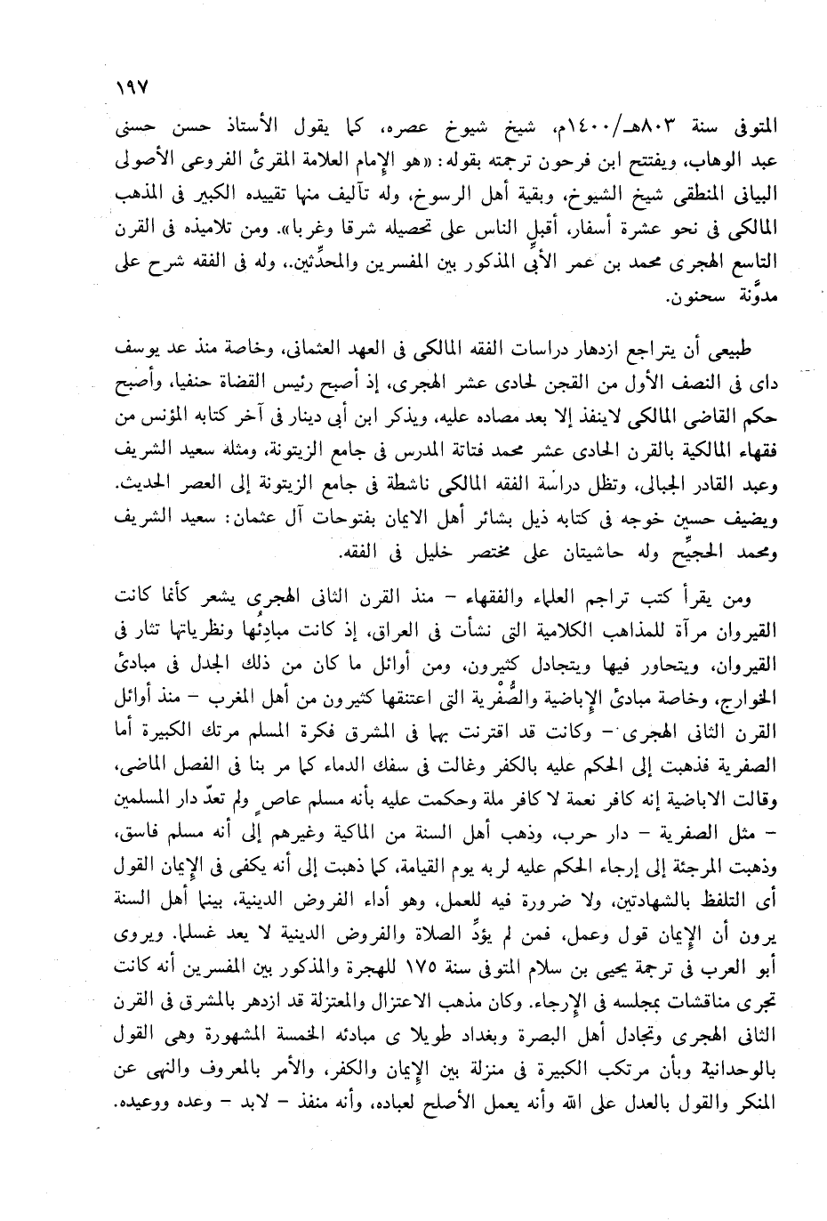 ومن يقرأ كتب تراجم العلماء والفقهاء-منذ القرن الثانى الهجرى يشعر كأنما كانت القيروان مرآة للمذاهب الكلامية التى نشأت فى العراق، إذ كانت مبادئها ونظرياتها تثار فى القيروان، ويتحاور فيها ويتجادل كثيرون، ومن أوائل ما كان من ذلك الجدل فى مبادئ الخوارج، وخاصة مبادئ الإباضية والصّفرية التى اعتنقها كثيرون من أهل المغرب-منذ أوائل القرن الثانى الهجرى-وكانت قد اقترنت بهما فى المشرق فكرة المسلم مرتك الكبيرة أما الصفرية فذهبت إلى الحكم عليه بالكفر وغالت فى سفك الدماء كما مر بنا فى الفصل الماضى، وقالت الاباضية إنه كافر نعمة لا كافر ملة وحكمت عليه بأنه مسلم عاص ولم تعدّ دار المسلمين -مثل الصفرية-دار حرب، وذهب أهل السنة من المالكية وغيرهم إلى أنه مسلم فاسق، وذهبت المرجئة إلى إرجاء الحكم عليه لربه يوم القيامة، كما ذهبت إلى أنه يكفى فى الإيمان القول أى التلفظ بالشهادتين، ولا ضرورة فيه للعمل، وهو أداء الفروض الدينية، بينما أهل السنة يرون أن الإيمان قول وعمل، فمن لم يؤدّ الصلاة والفروض الدينية لا يعد مسلما. ويروى أبو العرب فى ترجمة يحيى بن سلام المتوفى سنة 175 للهجرة والمذكور بين المفسرين أنه كانت تجرى مناقشات بمجلسه فى الإرجاء. وكان مذهب الاعتزال والمعتزلة قد ازدهر بالمشرق فى القرن الثانى الهجرى وتجادل أهل البصرة وبغداد طويلا ومبادئه الخمسة المشهورة وهى القول بالوحدانية وبأن مرتكب الكبيرة فى منزلة بين الإيمان والكفر، والأمر بالمعروف والنهى عن المنكر والقول بالعدل على الله وأنه يعمل الأصلح لعباده، وأنه منفذ-لا بد-وعده ووعيده.