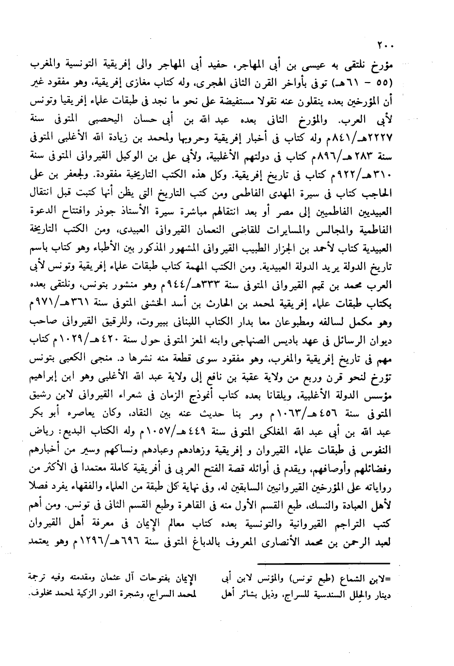 مؤرخ نلتقى به عيسى بن أبى المهاجر، حفيد أبى المهاجر والى إفريقية التونسية والمغرب (55 - 61 هـ) توفى بأواخر القرن الثانى الهجرى، وله كتاب مغازى إفريقية، وهو مفقود غير أن المؤرخين بعده ينقلون عنه نقولا مستفيضة على نحو ما نجد فى طبقات علماء إفريقيا وتونس لأبى العرب. والمؤرخ الثانى بعده عبد الله بن أبى حسان اليحصبى المتوفى سنة 2227 هـ/841 م وله كتاب فى أخبار إفريقية وحروبها ولمحمد بن زيادة الله الأغلبى المتوفى سنة 283 هـ/896 م كتاب فى دولتهم الأغلبية، ولأبى على بن الوكيل القيروانى المتوفى سنة 310 هـ/922 م كتاب فى تاريخ إفريقية. وكل هذه الكتب التاريخية مفقودة. ولجعفر بن على الحاجب كتاب فى سيرة المهدى الفاطمى ومن كتب التاريخ التى يظن أنها كتبت قبل انتقال العبيديين الفاطميين إلى مصر أو بعد انتقالهم مباشرة سيرة الأستاذ جوذر وافتتاح الدعوة الفاطمية والمجالس والمسايرات للقاضى النعمان القيروانى العبيدى، ومن الكتب التاريخية العبيدية كتاب لأحمد بن الجزار الطبيب القيروانى المشهور المذكور بين الأطباء وهو كتاب باسم تاريخ الدولة يريد الدولة العبيدية. ومن الكتب المهمة كتاب طبقات علماء إفريقية وتونس لأبى العرب محمد بن تميم القيروانى المتوفى سنة 333 هـ/944 م وهو منشور بتونس، ونلتقى بعده بكتاب طبقات علماء إفريقية لمحمد بن الحارث بن أسد الخشنى المتوفى سنة 361 هـ/971 م وهو مكمل لسالفه ومطبوعان معا بدار الكتاب اللبنانى ببيروت، وللرقيق القيروانى صاحب ديوان الرسائل فى عهد باديس الصنهاجى وابنه المعز المتوفى حول سنة 420 هـ/1029 م كتاب مهم فى تاريخ إفريقية والمغرب، وهو مفقود سوى قطعة منه نشرها د. منجى الكعبى بتونس تؤرخ لنحو قرن وربع من ولاية عقبة بن نافع إلى ولاية عبد الله الأغلبى وهو ابن إبراهيم مؤسس الدولة الأغلبية، ويلقانا بعده كتاب أنموذج الزمان فى شعراء القيروانى لابن رشيق المتوفى سنة 456 هـ/1063 م ومر بنا حديث عنه بين النقاد، وكان يعاصره أبو بكر عبد الله بن أبى عبد الله المغلكى المتوفى سنة 449 هـ/1057 م وله الكتاب البديع: رياض النفوس فى طبقات علماء القيروان وإفريقية وزهادهم وعبادهم ونساكهم وسير من أخبارهم وفضائلهم وأوصافهم، ويقدم فى أوائله قصة الفتح العربى فى أفريقية كاملة معتمدا فى الأكثر من رواياته على المؤرخين القيروانيين السابقين له، وفى نهاية كل طبقة من العلماء والفقهاء يفرد فصلا لأهل العبادة والنسك، طبع القسم الأول منه فى القاهرة وطبع القسم الثانى فى تونس. ومن أهم كتب التراجم القيروانية والتونسية بعده كتاب معالم الإيمان فى معرفة أهل القيروان لعبد الرحمن بن محمد الأنصارى المعروف بالدباغ المتوفى سنة 696 هـ/1296 م وهو يعتمد