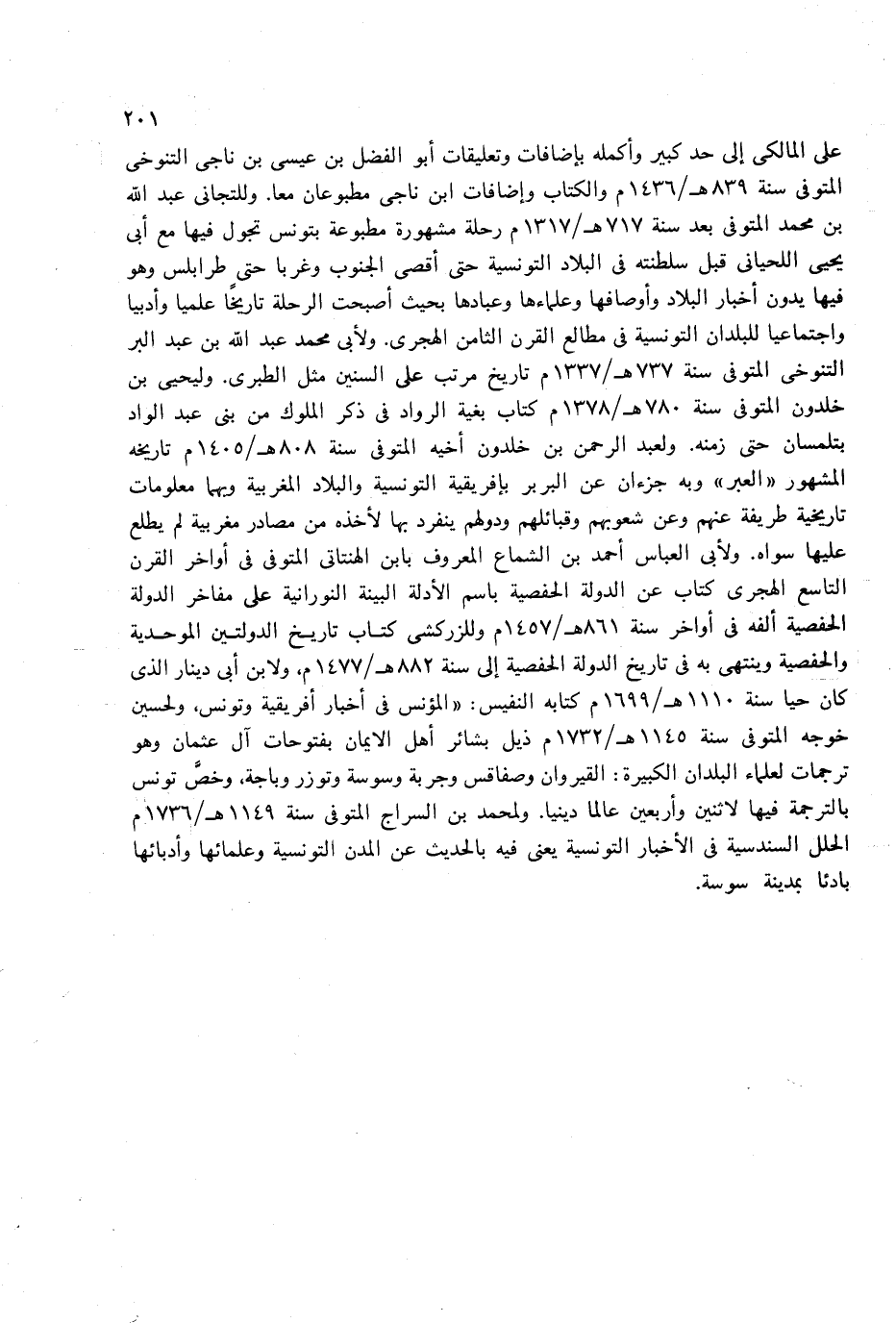 على المالكى إلى حد كبير وأكمله بإضافات وتعليقات أبو الفضل بن عيسى بن ناجى التنوخى المتوفى سنة 839 هـ/1436 م والكتاب وإضافات ابن ناجى مطبوعان معا. وللتجانى عبد الله بن محمد المتوفى بعد سنة 717 هـ/1317 م رحلة مشهورة مطبوعة بتونس تجول فيها مع أبى يحيى اللحيانى قبل سلطنته فى البلاد التونسية حتى أقصى الجنوب وغربا حتى طرابلس وهو فيها يدون أخبار البلاد وأوصافها وعلماءها وعبادها بحيث أصبحت الرحلة تاريخا علميا وأدبيا واجتماعيا للبلدان التونسية فى مطالع القرن الثامن الهجرى. ولأبى محمد عبد الله بن عبد البر التنوخى المتوفى سنة 737 هـ/1337 م تاريخ مرتب على السنين مثل الطبرى. وليحيى بن خلدون المتوفى سنة 780 هـ/1378 م كتاب بغية الرواد فى ذكر الملوك من بنى عبد الواد بتلمسان حتى زمنه. ولعبد الرحمن بن خلدون أخيه المتوفى سنة 808 هـ/1405 م تاريخه المشهور «العبر» وبه جزءان عن البربر بإفريقية التونسية والبلاد المغربية وبهما معلومات تاريخية طريفة عنهم وعن شعوبهم وقبائلهم ودولهم ينفرد بها لأخذه من مصادر مغربية لم يطلع عليها سواه. ولأبى العباس أحمد بن الشماع المعروف بابن الهنتاتى المتوفى فى أواخر القرن التاسع الهجرى كتاب عن الدولة الحفصية باسم الأدلة البينة النورانية على مفاخر الدولة الحفصية ألفه فى أواخر سنة 861 هـ/1457 م وللزركشى كتاب تاريخ الدولتين الموحدية والحفصة وينتهى به فى تاريخ الدولة الحفصية إلى سنة 882 هـ/1477 م، ولابن أبى دينار الذى كان حيا سنة 1110 هـ/1699 م كتابه النفيس: «المؤنس فى أخبار أفريقية وتونس، ولحسين خوجه المتوفى سنة 1145 هـ/1732 م ذيل بشائر أهل الايمان بفتوحات آل عثمان وهو ترجمات لعلماء البلدان الكبيرة: القيروان وصفاقس وجربة وسوسة وتوزر وباجة، وخصّ تونس بالترجمة فيها لاثنين وأربعين عالما دينيا. ولمحمد بن السراج المتوفى سنة 1149 هـ/1736 م الحلل السندسية فى الأخبار التونسية يعنى فيه بالحديث عن المدن التونسية وعلمائها وأدبائها بادئا بمدينة سوسة.