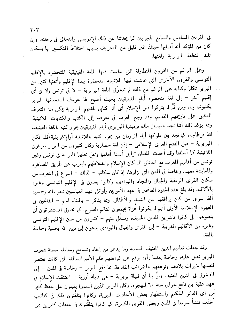 وعلى الرغم من القرون المتطاولة التى عاشت فيها اللغة الفينيقية المتحضرة بالإقليم التونسى والقرون الأخرى التى عاشت فيها اللاتينية المتحضرة بهذا الإقليم وأتقنها كثير من البربر تكلما وكتابة على الرغم من ذلك لم تتحوّل اللغة البربرية-لا فى تونس ولا فى أى إقليم آخر-إلى لغة متحضرة أيام الفينيقيين بحيث أصبح لها حروف استحدثها البربر يكتبونها بها، ومن ثمّ لم يتركوا قبل الإسلام أى أثر كتابى بلغتهم البربرية يمكن منه التعرف الدقيق على تاريخهم القديم، وقد رجع العرب فى معرفته إلى الكتب والكتابات اللاتينية، ومما يؤكد ذلك أننا نجد يامبسال ملك نوميديا البربرى أيام الفينيقيين يحرر كتبه باللغة الفينيقية لغة قرطاجة، كما نجد بين ملوكها أيام الرومان من يحرر كتبه باللاتينية أو الإغريقية، فلم تكن البربرية-قبل الفتح العربى الإسلامى-إذن لغة حضارية وكان كثيرون من البربر يعرفون اللاتينية كما أسلفنا وقد أخذت اللغتان تزايل ألسنة أهلهما وتحل محلهما العربية فى تونس وغير تونس من أقاليم المغرب مع اعتناق السكان الإسلام واختلاطهم بالعرب عن طريق المصاهرة والمعايشة معهم، وخاصة فى المدن التى نزلوها، إذ كان سكانها-لذلك-أسرع فى التعرب من سكان القرى الريفية والجبال والنجاد والبوادى، وكانوا يعدون فى الإقليم التونسى وغيره بالآلاف، وقد بلغ عدد الجنود الفاتحين فى عهد الأمويين وأوائل عهد العباسيين نحو مائة وخمسين ألفا سوى من كان يرافقهم من النساء والأطفال، ومما يذكر-بالثناء الجم-للفاتحين فى العهود الإسلامية الأولى أنهم لم يكونوا غزاة يجمعون غنائم الفتوح، كما يحاول المستشرقون أن ينعتوهم، بل كانوا ناشرين للدين الحنيف، وتسلّل منهم-كثيرون من مدن الإقليم التونسى وغيره من الأقاليم المغربية-إلى القرى والجبال والبوادى يدعون إلى دين الله بحمية وحماسة بالغة.