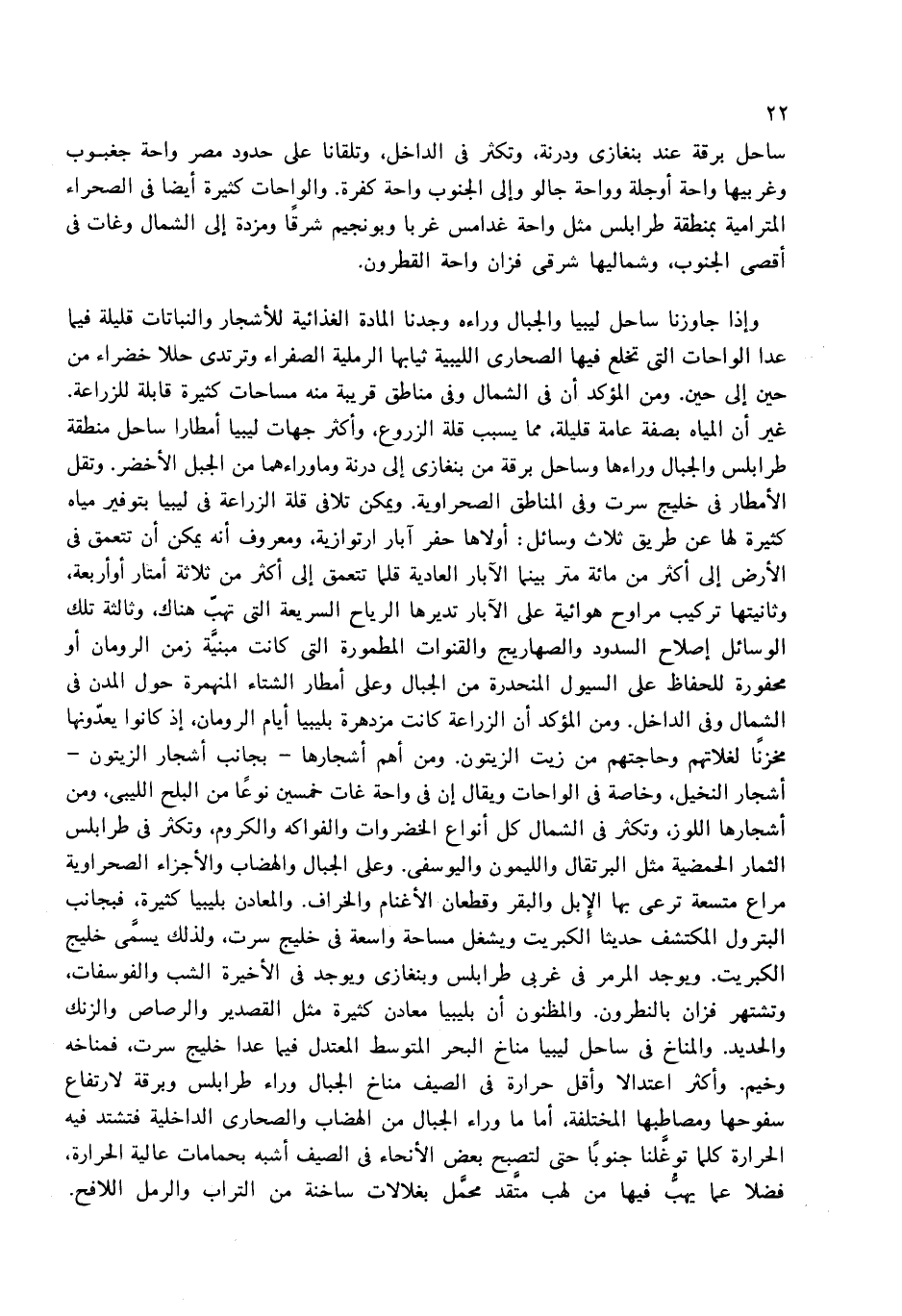 وإذا جاوزنا ساحل ليبيا والجبال وراءه وجدنا المادة الغذائية للأشجار والنباتات قليلة فيما عدا الواحات التى تخلع فيها الصحارى الليبية ثيابها الرملية الصفراء وترتدى حللا خضراء من حين إلى حين. ومن المؤكد أن فى الشمال وفى مناطق قريبة منه مساحات كثيرة قابلة للزراعة.