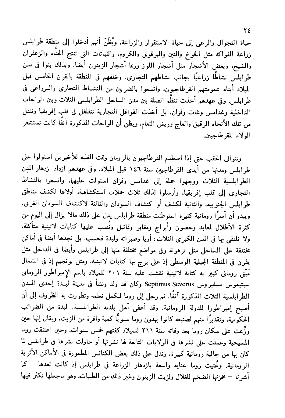 حياة التجوال والرعى إلى حياة الاستقرار والزراعة، ويظنّ أنهم أدخلوا إلى منطقة طرابلس زراعة الفواكه مثل الخوخ والتين والبرقوق والكروم، والنباتات التى تنتج الحنّاء والزعفران والشيح، وبعض الأشجار مثل أشجار اللوز وربما أشجار الزيتون أيضا. وبذلك بثوا فى مدن طرابلس نشاطا زراعيا بجانب نشاطهم التجارى. وخلفهم فى المنطقة بالقرن الخامس قبل الميلاد أبناء عمومتهم القرطاجيون، واتسعوا بالضربين من النشاط التجارى والزراعى فى طرابلس. وفى عهدهم أخذت تنظّم الصلة بين مدن الساحل الطرابلسى الثلاث وبين الواحات الداخلية وغدامس وغات وفزان، بل أخذت القوافل التجارية تتغلغل فى قلب إفريقيا وتنقل من تلك الأنحاء الرقيق والعاج وريش النعام، ويظن أن الواحات المذكورة آنفا كانت تستشعر الولاء للقرطاجيين.