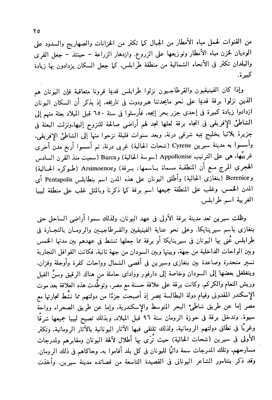 وإذا كان الفينيقيون والقرطاجيون نزلوا طرابلس قديما قرونا متعاقبة فإن اليونان هم الذين نزلوا برقة قديما على نحو ما يحدثنا هيرودوت فى تاريخه، إذ يذكر أن السكان اليونان ازدادوا زيادة كبيرة فى إحدى جزر بحر إيجة، فأرسلوا فى سنة 650 قبل الميلاد بعثة منهم إلى الشاطئ الإفريقى فى اتجاه برقة لعلها تجد لهم أراضى صالحة للنزوح إليها، ونزلت البعثة فى جزيرة بلاتيا بخليج بمبه شرقى درنة، وبعد سنوات قليلة نزحوا منها إلى الشاطئ الإفريقى، وأسسوا به مدينة سيرين) Cyrene شحات الحالية) غربى درنة، ثم أسسوا أربع مدن أخرى غربيّها، هى على الترتيب) Appollonise سوسة الحالية) و) Barca سميت منذ القرن السادس الهجرى المرج مع أن المنطقة مسماة باسمها: برقة) و) Arsimoenoe طوكره الحالية) و) Berenice بنغازى الحالية) وأطلق اليونان على هذه المدن اسم بنطابلس Pentapolis أى المدن الخمس. وغلب على المنطقة جميعها اسم برقة كما ذكرنا وبالمثل غلب على منطقة ليبيا الغربية اسم طرابلس.