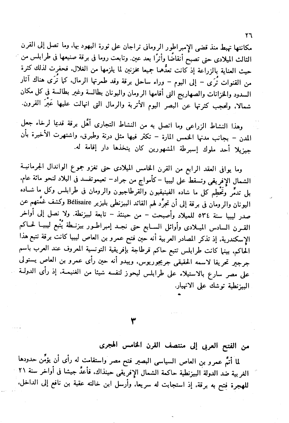 مكانتها تهبط منذ قضى الإمبراطور الرومانى تراجان على ثورة اليهود بها، وما تصل إلى القرن الثالث الميلادى حتى تصبح أنقاضا وأثرا بعد عين. وتابعت روما فى برقة صنيعها فى طرابلس من حيث العناية بالزراعة إذ كانت تعدّهما جميعا مخزنين لما يلزمها من الغلال، فحفرت لذلك كثرة من القنوات ترى-إلى اليوم-وراء ساحل برقة وقد طمرتها الرمال، كما ترى هناك آثار السدود والخزانات والصهاريج التى أقامها الرومان واليونان بطالسة وغير بطالسة فى كل مكان شمالا، وتحجب كثرتها عن البصر اليوم الأتربة والرمال التى انهالت عليها عبر القرون.